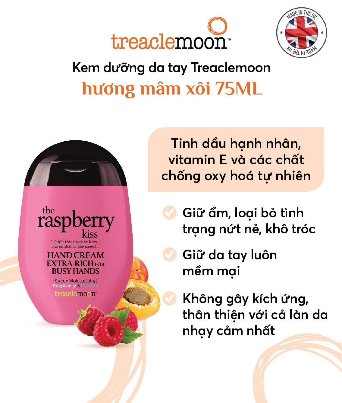 Kem dưỡng da tay chiết xuất Quả mâm xôi Treaclemoon giàu vitamin E, các chất chống oxy hóa tự nhiên cho da Kem dưỡng tay tinh chất quả mâm xôi Treaclemoon giúp tái tạo da,
