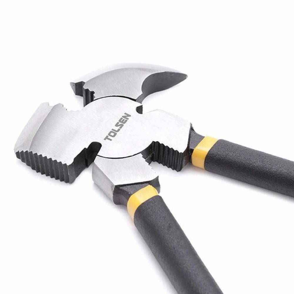 Mua tại TiktokKềm hàng rào 10 inch/250mm Tolsen 10301 dùng để đóng/nhổ đinh kẹp, giữ và kéo thẳng dây, nối dây, cắt dâ Kềm được sử dụng rộng rãi trong các ngành kỹ thuật điện, xây dựng, cơ khí, gara ô tô, gia đình… Ưu điểm nổi bật kềm Tolsen 10301 •Kềm không gỉ, có độ bền cao •Thiết kế nhỏ gọn, tinh xảo •Cấu tạo đơn giản giúp thao tác thuận tiện •Sản phẩm chống gỉ sét, chịu được các điều kiện làm việc khắc nghiệt •Thích hợp sử dụng trong nhiều ngành nghề •An toàn và dễ dàng sử dụng •Hiệu quả sử dụng lâu dài Được sử dụng để làm hàng rào thép gai, thép B40. Ngoài ra, với các phụ kiện như búa, móc mũi nhọn, cắt kẽm,đi kèm, có thể dễ dàng kết hợp các chức năng của kìm để mang lại hiệu quả cao nhất Thông số kĩ thuật