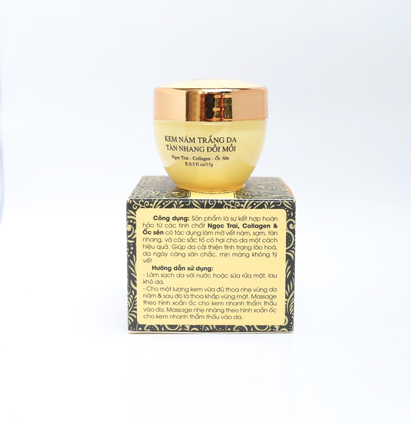 Sản phẩm là sự kết hợp hoàn toàn từ các tinh chất Ngọc trai, collagen và ốc sên có tác dụng làm mờ vết nám, sạm, tàn nhang, và các sắc tố có hại cho
