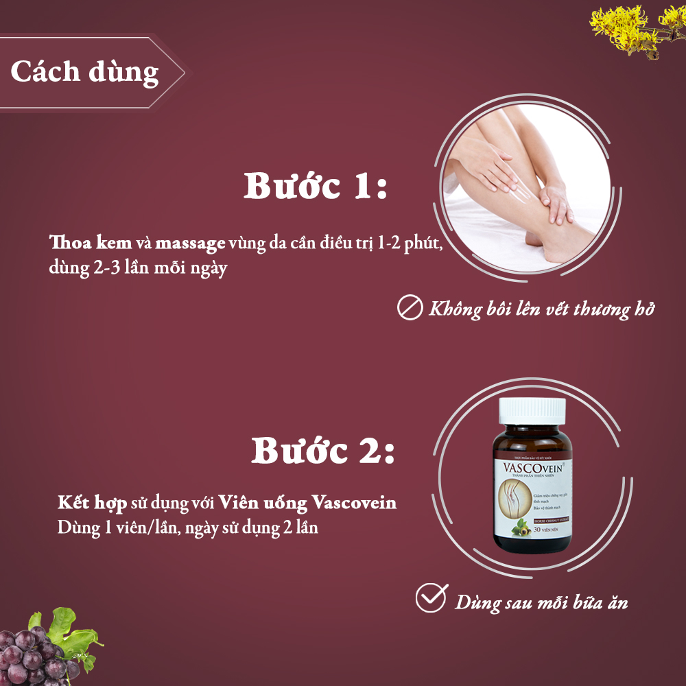 Lấy lượng kem vừa đủ Kem Vascovein Phòng Ngừa Suy Giãn Tĩnh Mạch xoa nhẹ lên vùng da bị giãn tĩnh mạch, để kem thấm đều. Sử dụng 2-3 lần/ngày.. Nên kết hợp sử dụng với Viên Uống Hỗ Trợ Điều Trị Và Phòng Ngừa Suy Giãn Tĩnh Mạch Vascovein để đạt được hiệu quả tối ưu.