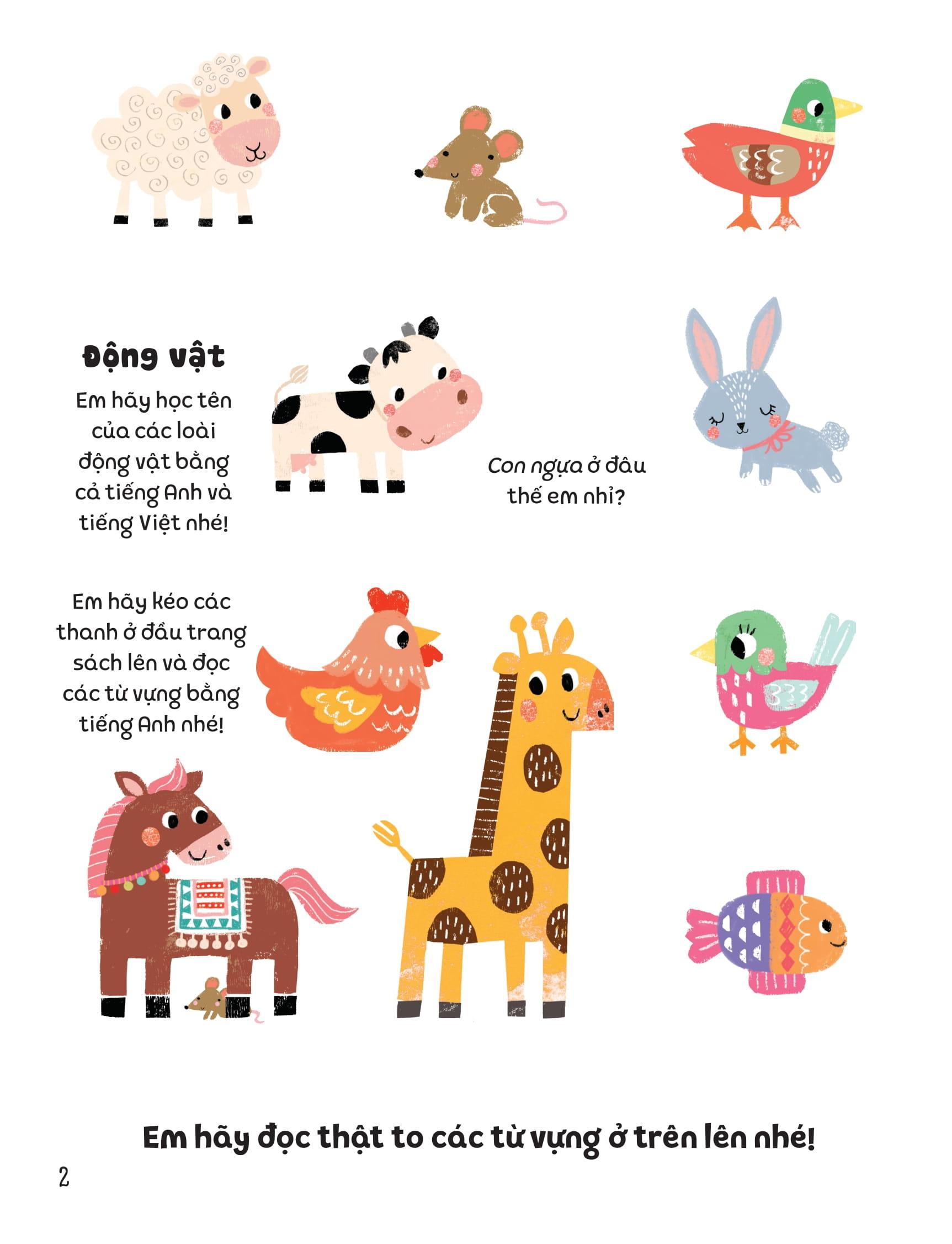 • Dưới mỗi hình ảnh là từ vựng Tiếng Việt. Và chỉ cần trẻ kéo những thanh bìa cứng là những từ vựng tiếng Anh tương ứng hiện ra, thú vị như một trò chơi lại giúp trẻ ghi nhớ tốt hơn.