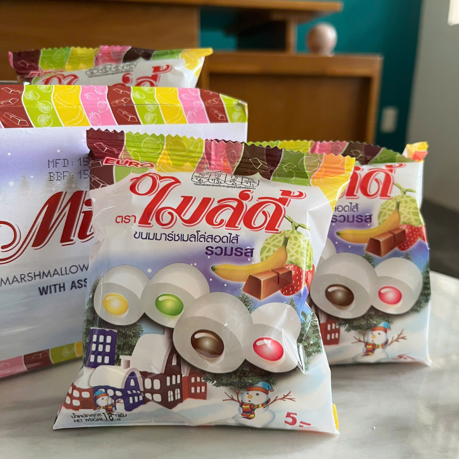 Mua tại TiktokMildy dòng kẹo Marshmallow với phiên bản nâng cấp mới lạ, bên ngoài mềm xốp, bên trong đẫm nhân trái cây thơm ngon với nhiều vị, hứa hẹn sẽ khuấy đảo trong thị trường ăn vặt sắp tới.