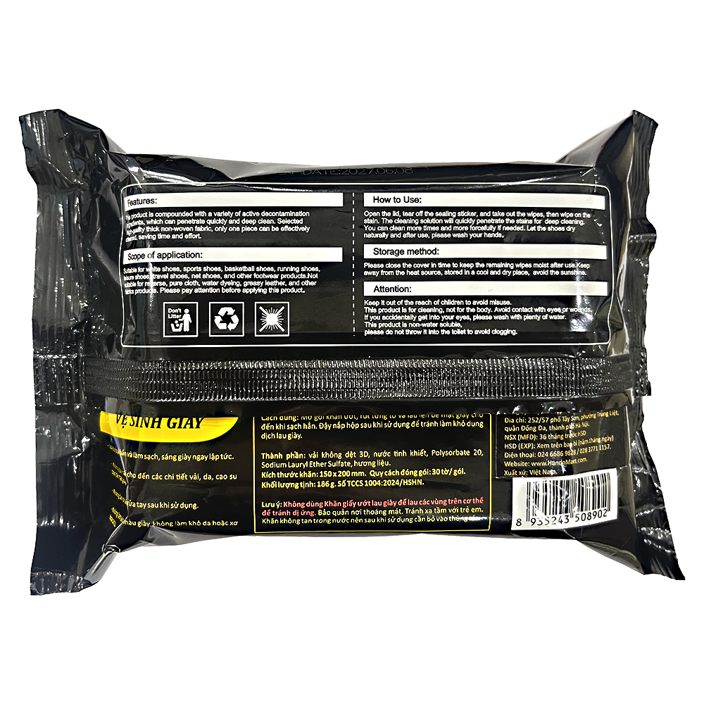 Mô tả sản phẩm Tác dụng, tính năng Khăn lau vệ sinh giày Hando + Làm sạch các vết bẩn, vết ố nhanh chóng, giúp đôi giày của bạn sáng bóng, trắng sạch như mới