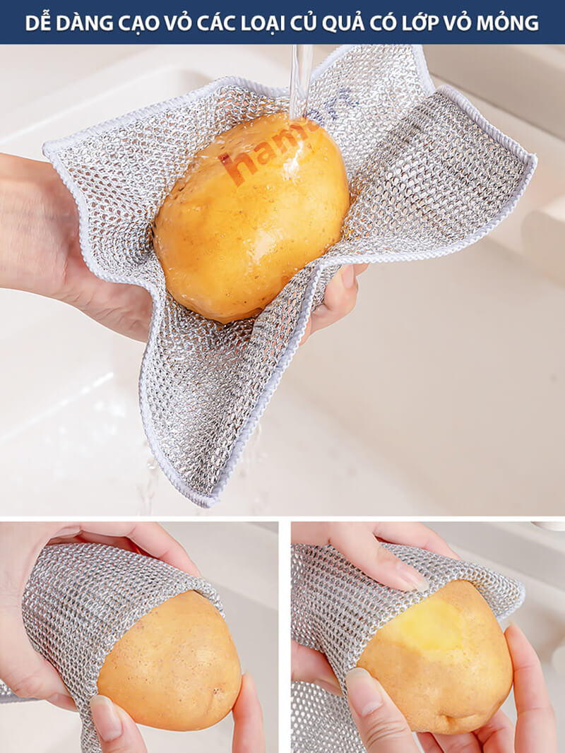 Khăn có 2 lớp lưới kim loại, giúp việc cọ rửa kỹ lưỡng, sử dụng lâu dài mà không lo rỉ sét