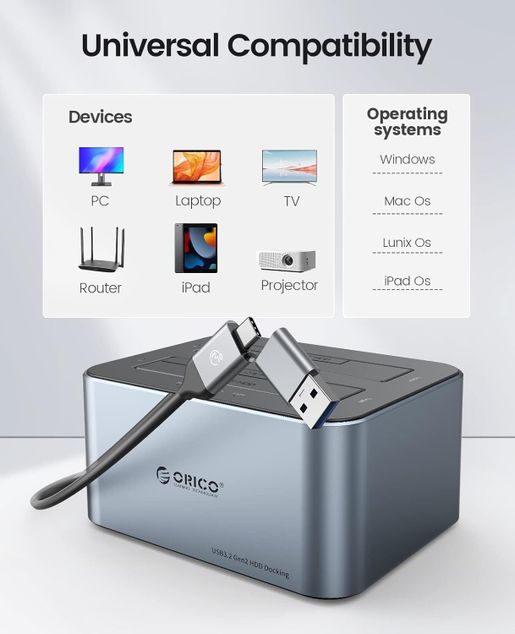Orico 6626C3-C-V1 có thiết kế hiện đại và chắc chắn với màu xám thời thượng, làm từ chất liệu nhựa ABS bền bỉ, mang đến độ bền cao và khả năng chịu va đập tốt. Docking hỗ trợ hai khe cắm cho các loại ổ cứng 2.5” và 3.5”, cho phép người dùng sao lưu hoặc chuyển dữ liệu giữa hai ổ cứng cùng lúc mà không cần tháo lắp phức tạp. Thiết kế này cũng thân thiện với người dùng, giúp dễ dàng thao tác và bảo vệ ổ cứng khi không sử dụng.