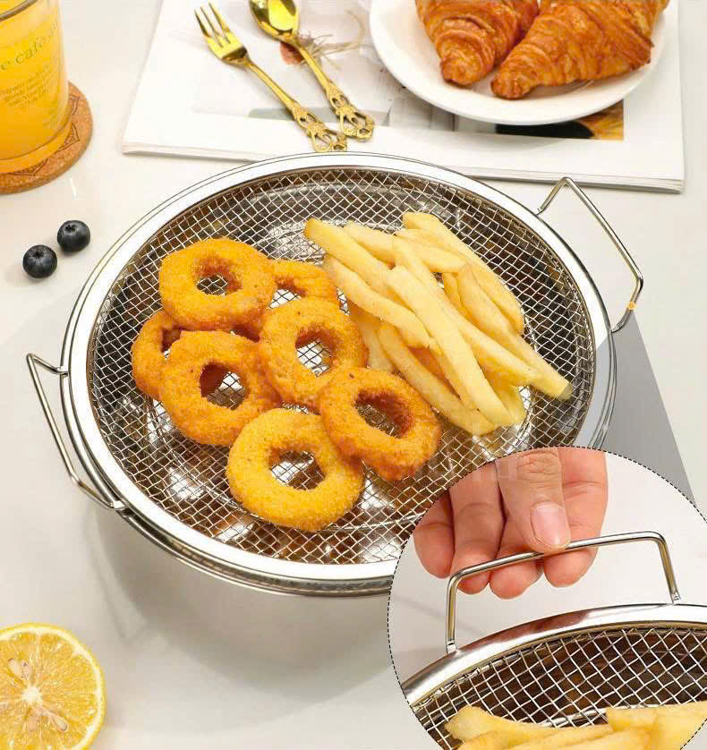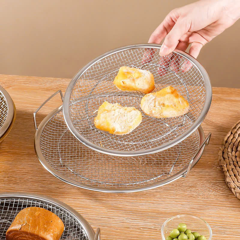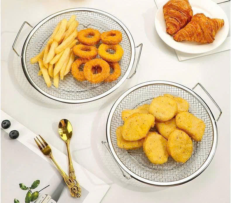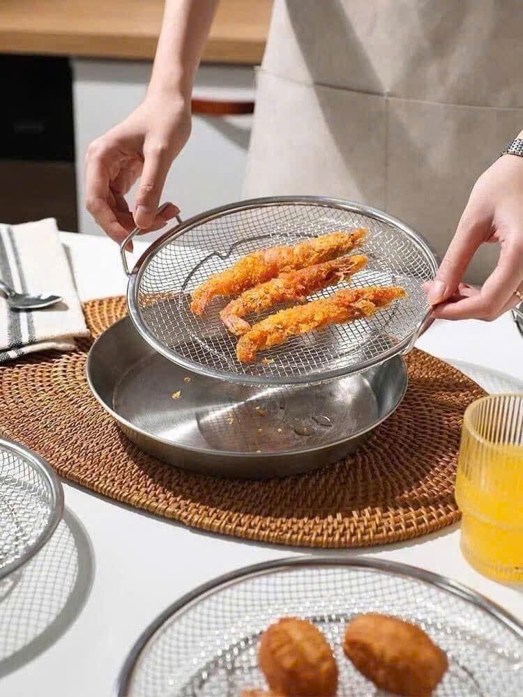 Khay Tròn Inox 304 Kèm Ray Lưới Lọc Ráo Dầu Chiên Thức Ăn Đa Năng Tiện Dụng 19cm Khay tròn inox 304 kèm ray lưới lọc ráo dầu chiên thức ăn là một dụng cụ