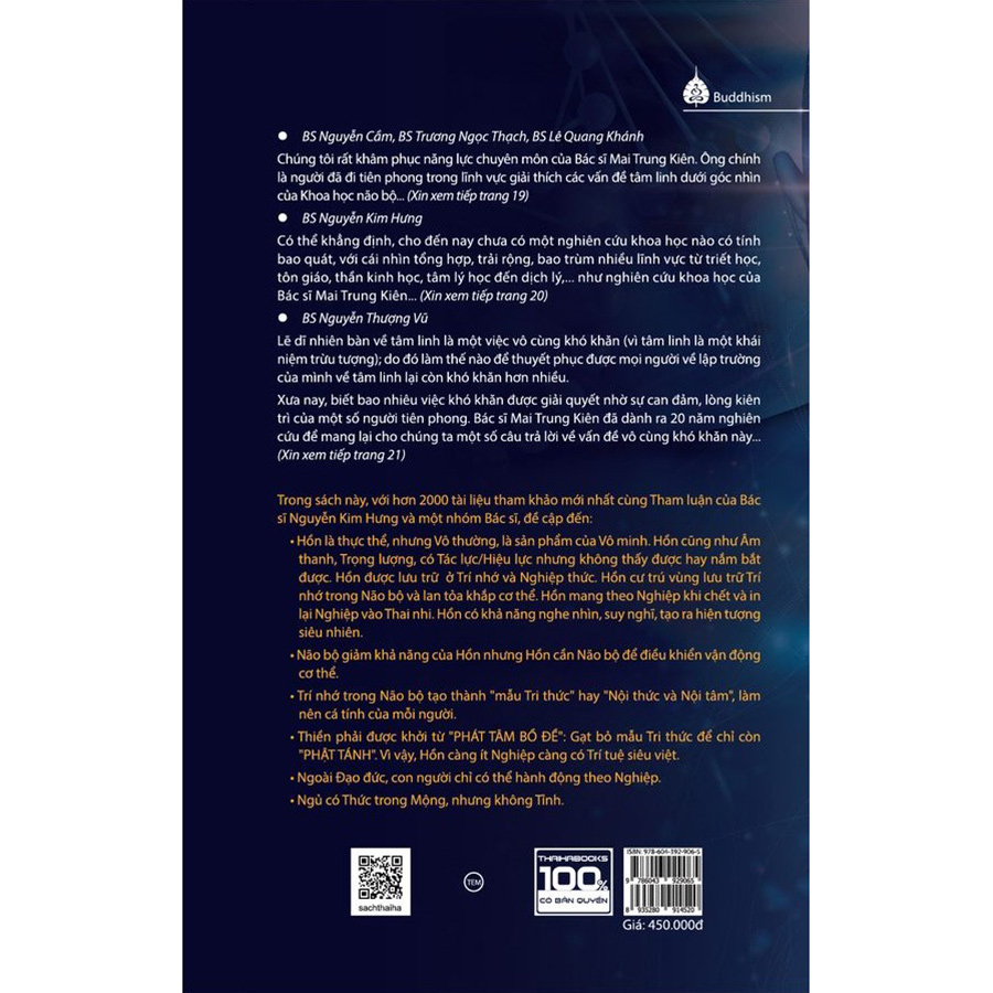 Bs. Mai Trung Kiên là một Giáo sư Bệnh Lý học lại am hiểu các Triết Thuyết và các Tín Ngưỡng Hồi Giáo, Thiên Chúa Giáo nhất là Phật Giáo cùng Phật học nên có đủ cơ sở kiến thức viết các mối liên hệ giữa Não bộ là vật chất cụ thể với các trạng thái trừu tượng của Tâm Hồn, Thiền Định, Trí Nhớ, Tri Thức, Thông M Thật ích lợi thực tế trong những chương đề cập tới Giấc Ngủ, Mộng Mị, Đau Ngứa hay cao sâu hơn về Tham Sân Si, Từ Bi Bác Ái. Thật thú vị trong những chương bàn về Tình Yêu Cha Con, Mẹ Con nhất là Nam Nữ Luyến Ái. Chuyện đời hư hư thực thực “Sắc Sắc Không Không” nên Đức Phật trước khi viên tịch đã phải chối bỏ những gì đã nói “Ta chưa hề nói gì!”.