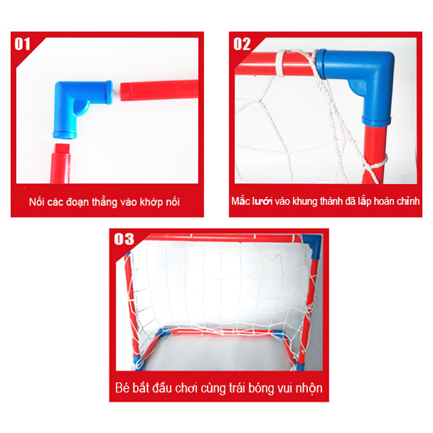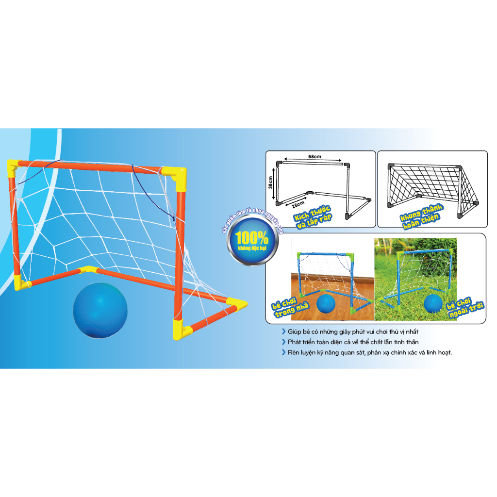- Tạo được KỸ NĂNG THIẾT LẬP MỤC TIÊU. Lợi ích của sản phẩm: Nuôi dạy và khai phá tình yêu bóng đá của các bé Tạo sân chơi thú vị cho các bé mùa hè này: Với khung thành bong đá đi động, các bé có thể chơi ở mọi nơi như trong nhà, ngoài sân. Giúp trẻ phát triển cả về thể chất lẫn tinh thần Rèn luyện kỹ năng quan sát, phản xạ chính xác và linh hoạt Các ưu điểm nổi bật của sản phẩm SP được làm từ 100% nhựa nguyên sinh an toàn cho bé Bộ đồ chơi khung thành bóng đá được thiết kế hình khung thành nhựa có phần đỡ đằng sau,các thanh nhựa được nối với nhau thông qua khớp nối Sản phẩm vô cùng tiện lợi Kích thước: