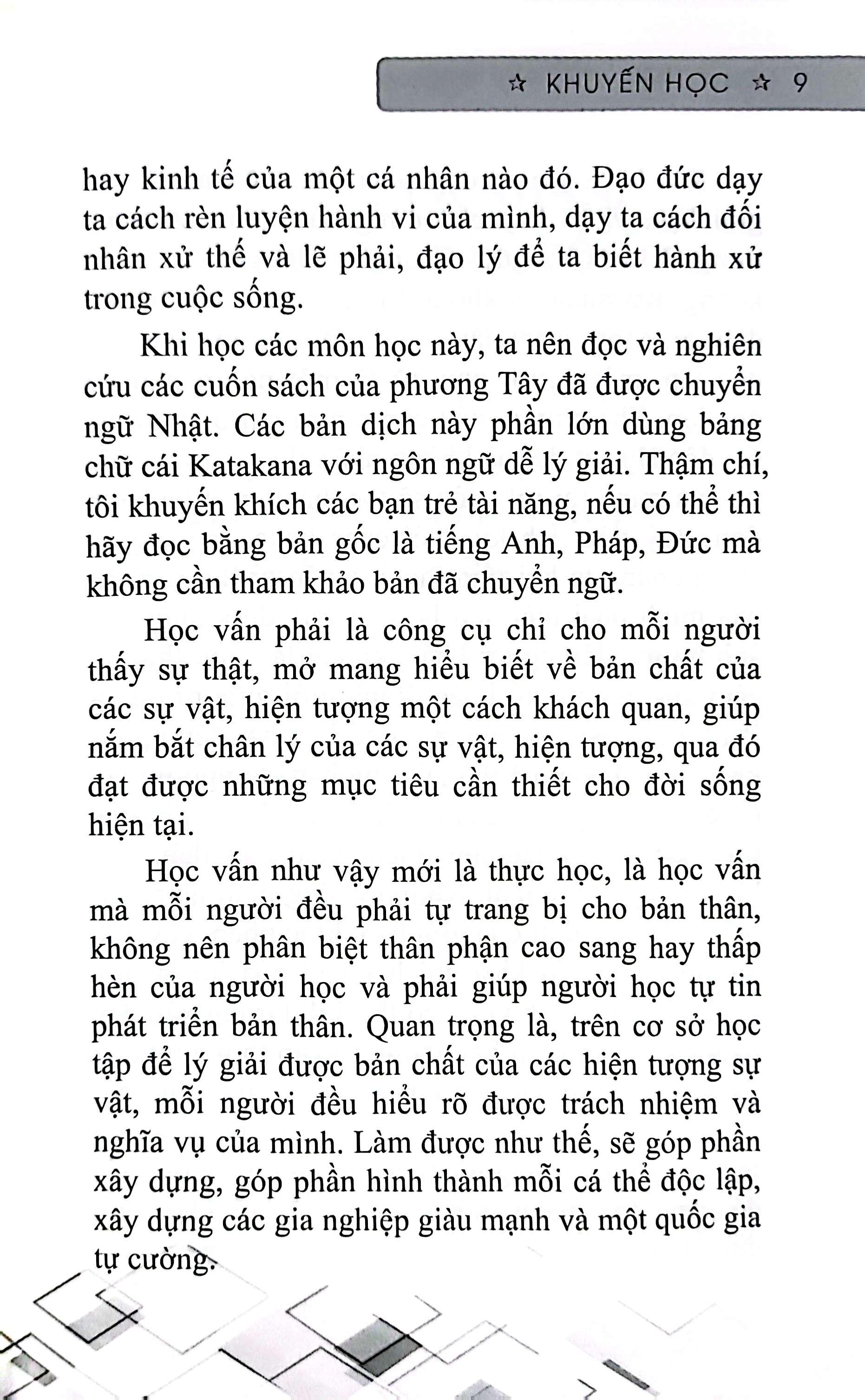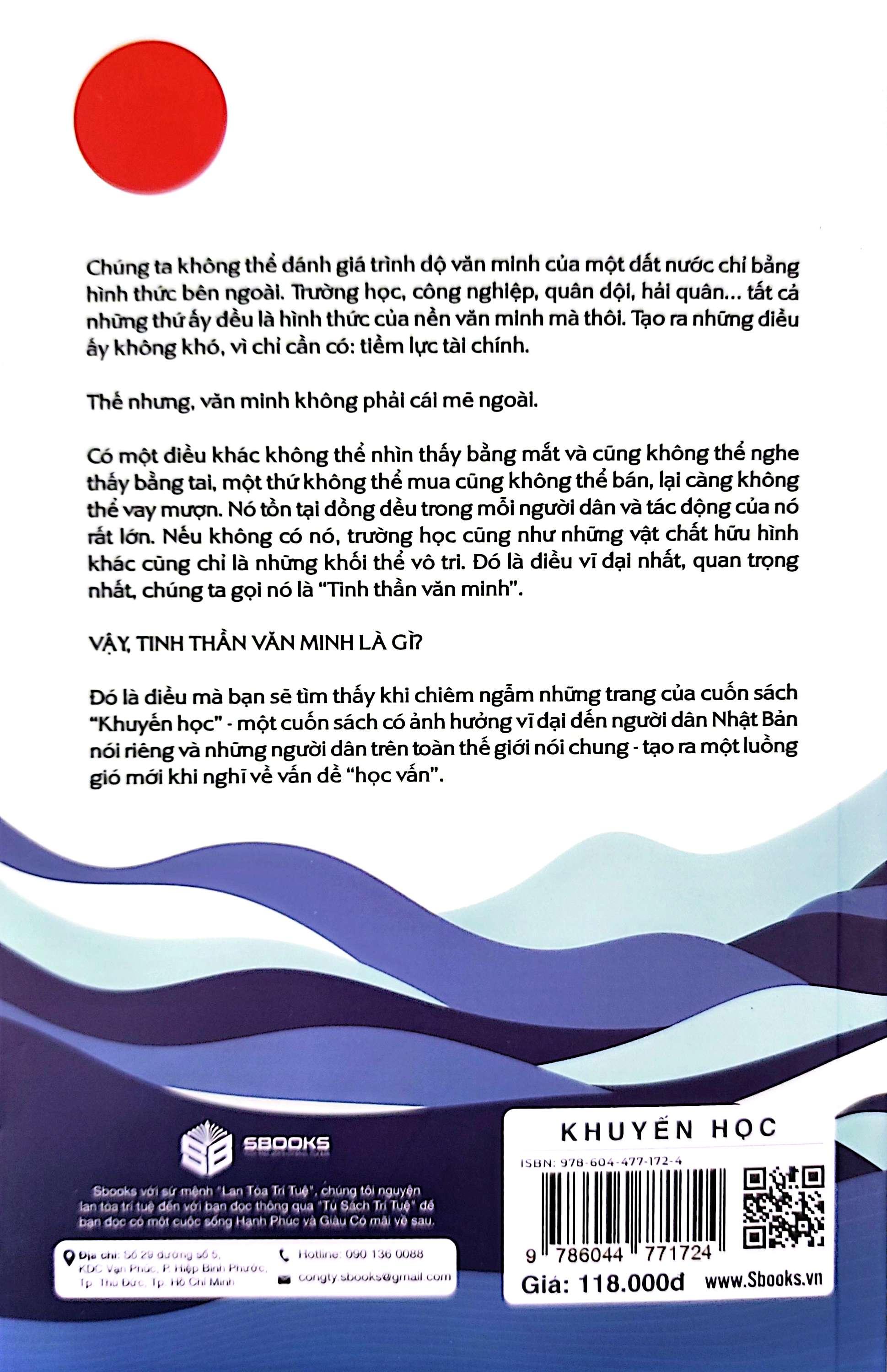 Khuyến Học Chúng ta không thể đánh giá trình độ văn minh của một đất nước chỉ bằng hình thức bên ngoài. Trường học, công nghiệp, quân đội, hải quân… tất cả những thứ ấy đều là hình thức của nền văn minh mà thôi. Tạo ra những điều ấy không khó, vì chỉ cần có: tiềm lực tài chính. Thế nhưng, văn minh không phải cái mẽ ngoài. Có một điều khác không thể nhìn thấy bằng mắt và cũng không thể nghe thấy bằng tai, một thứ không thể mua cũng không thể bán, lại càng không thể vay mượn. Nó tồn tại đồng đều trong mỗi người dân và tác động của nó rất lớn. Nếu không có nó, trường học cũng như những vật chất hữu hình khác cũng chỉ là những khối thể vô tri. Đó là điều vĩ đại nhất, quan trọng nhất, chúng ta gọi nó là “Tinh thần văn minh”. VẬY, TINH THẦN VĂN MINH LÀ GÌ? Đó là điều mà bạn sẽ tìm thấy khi chiêm ngẫm những trang của cuốn sách “Khuyến học” – một cuốn sách có ảnh hưởng vĩ đại đến người dân Nhật Bản nói riêng và những dân trên toàn thế giới nói chung – tạo ra một luồng gió mới khi nghĩ về vấn đề “học vấn”. Bản chất của văn minh là thúc đẩy nhận thức và đạo đức của con người. Ở đó, mỗi người là ông chủ của chính m.ình, ta giao lưu với những cá nhân khác trong xã hội nhưng không làm tổn hại đến nhau, ta được thực hiện đầy đủ quyền và hưởng trọn lợi ích của m.ình, để rồi từ đó ta góp phần xây dựng một xã hội an toàn, thịnh vượng. “Khuyến học” thổi một luồng gió mới vào tư tưởng và nhận thức của mỗi người, định nghĩa lại sự “văn minh”. Văn minh không phải là sự tự mãn đến từ giai cấp thống trị với những giáo điều về hy sinh tính mạng cho một đế chế nào đó. Văn minh không phải là kiêu ngạo và hạ thấp những số phận bé nhỏ của phụ nữ, nông phu. Văn minh càng không phải là giàu có, là đội quân hùng hổ. Văn minh của “Khuyến học” là sự thanh lọc tư tưởng, định hướng đến một xã hội công bình, trong sạch, giàu có về văn hóa, về ý thức tự chủ độc lập của một cá nhân dành cho chính bản thân và dành cho đất nước. Tác giả cuốn sách “Khuyến học” là một trong những nhà tư tưởng lớn nhất của Nhật Bản thời kỳ cận đại. Ông được xem như là “người khởi xướng” của phong trào canh tân nước Nhật, cổ động dân chúng loại bỏ tư duy lạc hậu thời cổ đại mà tiếp thu học thuật Tây phương, đưa Nhật Bản sánh bước với các nước Âu Mỹ. Fukuzawa Yukichi là nhà chính trị, nhà tư tưởng, nhà đấu tranh xã hội, nhà giáo dục tiên phong, nhà văn, nhà dịch thuật và là một võ sĩ.
