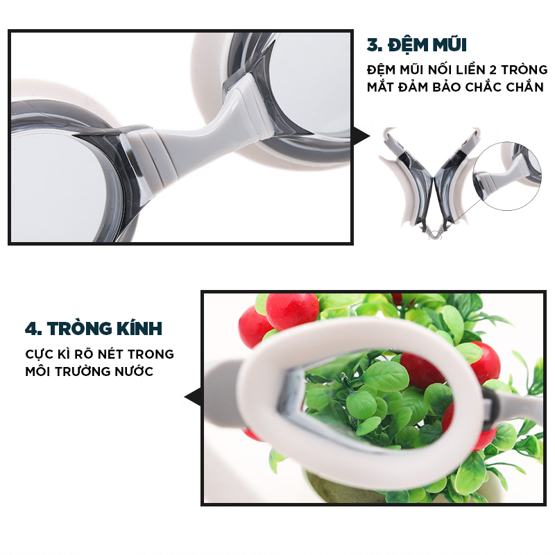 - Vòng cao su chụp mắt được làm 100% silicone không gây kích ứng da. Được thiết kế theo nhân trắc học, giúp kính ôm sát mắt, chống vào nước và giúp mở rộng tối đa góc nhìn khi đeo.