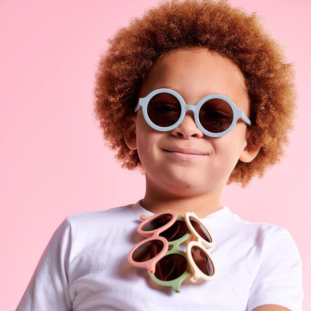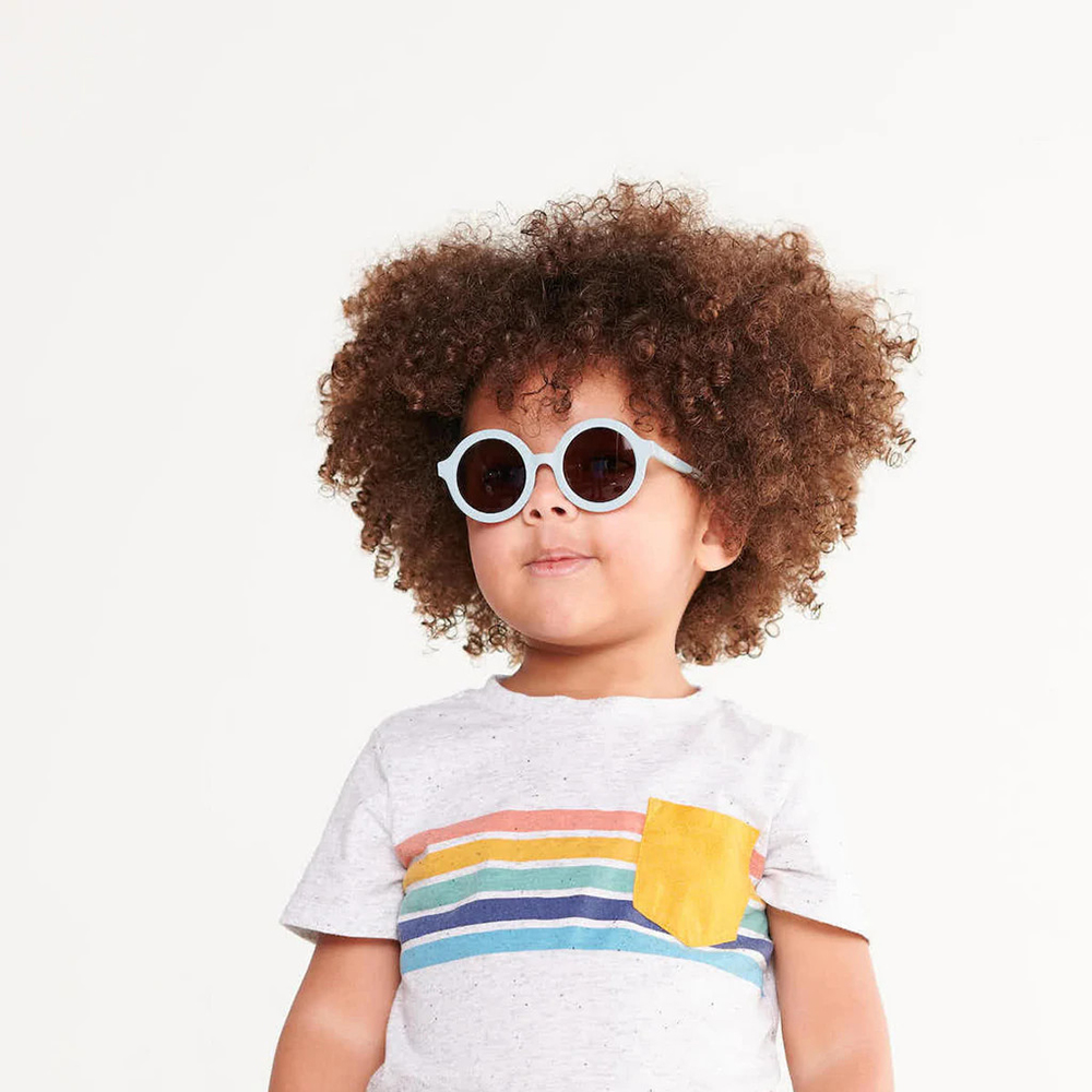 Ấn tượng: Kính chống tia cực tím với thiết kế hình tròn đáng yêu và màu xanh êm dịu phù hợp với cả bé trai và bé gái