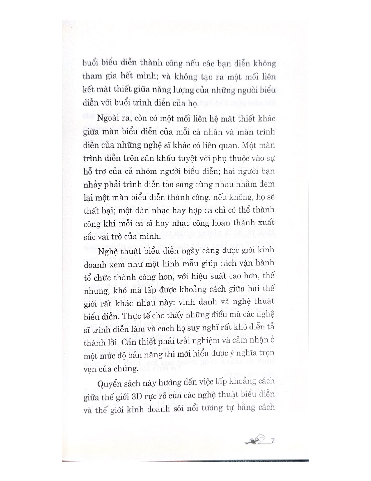 Kinh Doanh Như Trình Diễn Nghệ Thuật, Lãnh Đạo Như Đạo Diễn Sân Khấu là cách tiếp cận mới mẻ trong quản trị kinh doanh với châm ngôn: các tổ chức và các nhà lãnh đạo có thể học hỏi từ nghệ thuật. Mượn hình ảnh các nghệ sĩ biểu diễn các loại hình nghệ thuật khác nhau, tác giả nhấn mạnh một yếu tố không thể thiếu trong quản trị - kỹ thuật truyền cảm hứng, lấy con người làm trung tâm. Ngày nay, thành thạo kỹ thuật và nắm vững chuyên môn thôi chưa đủ để gặt hái được thành công như mong đợi, trong nghệ thuật lẫn trong kinh doanh. Chính vì lý do đó, nếu kinh doanh là một màn trình diễn thì hãy biến nó thành màn trình diễn chói sáng và để lại dấu ấn trong lòng khán giả.
