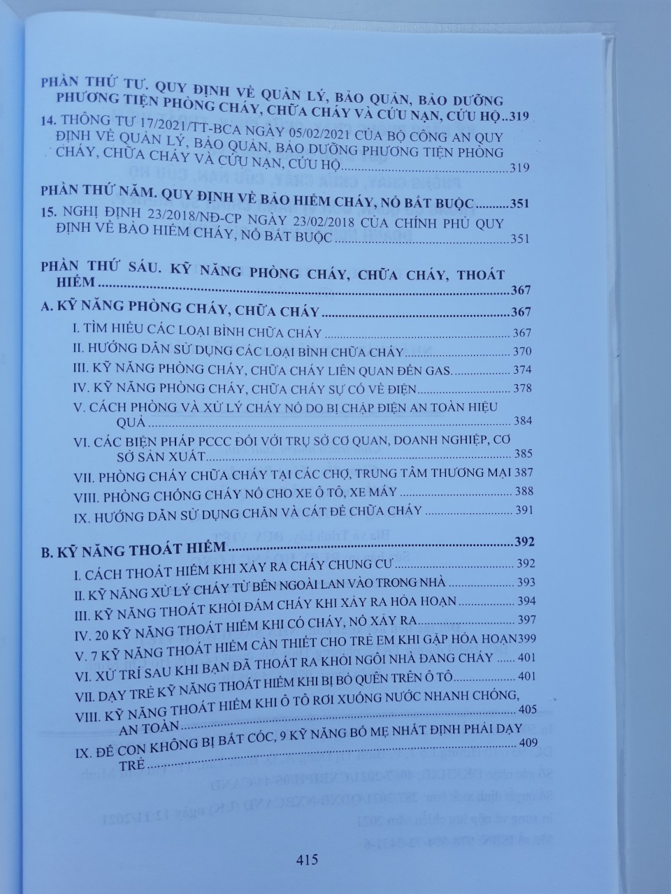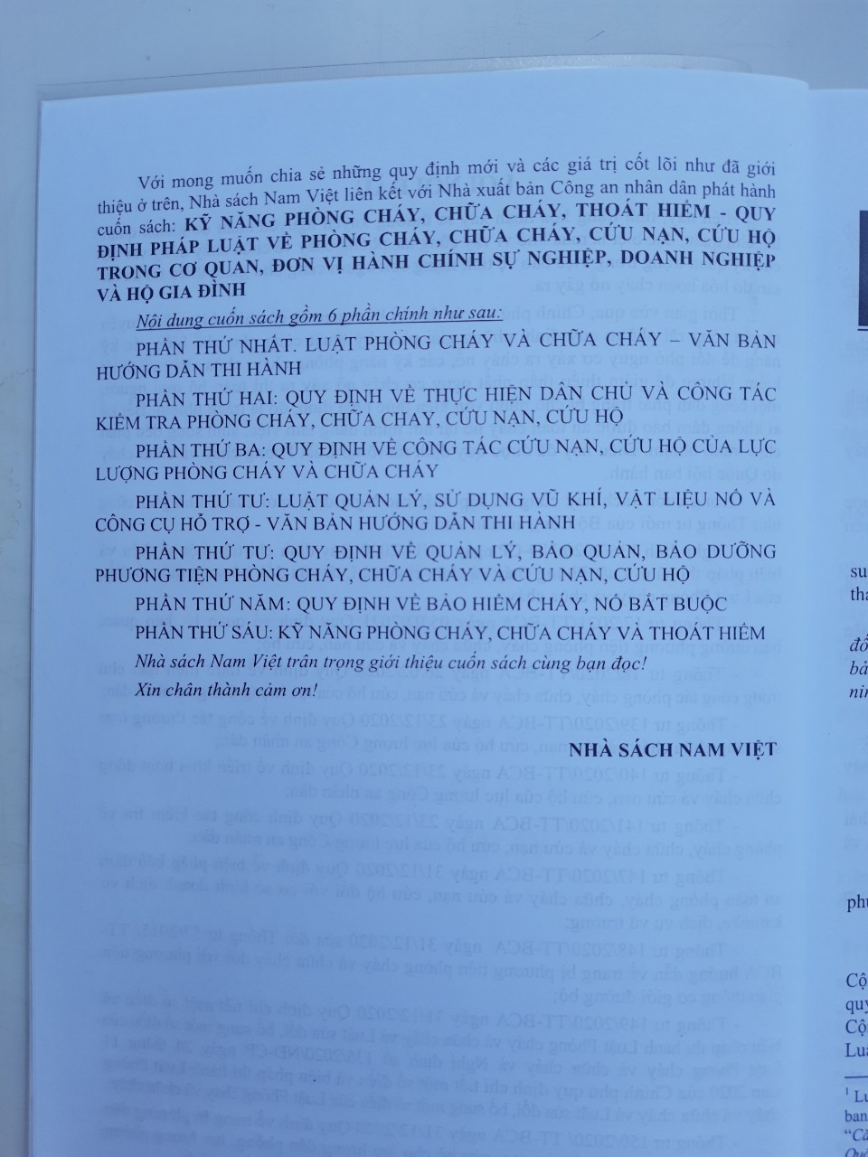 - Phần thứ tư: LUẬT QUẢN LÝ, SỬ DỤNG VŨ KHÍ, VẬT LIỆU NỔ VÀ CÔNG CỤ HỖ TRỢ - VĂN BẢN HƯỚNG DẪN THI HÀNH - Phần thứ năm: QUY ĐỊNH VỀ QUẢN LÝ, BẢO QUẢN, BẢO DƯỠNG PHƯƠNG TIỆN PHÒNG CHÁY, CHỮA CHÁY VÀ CỨU NẠN, CỨU HỘ - Phần thứ sáu: QUY ĐỊNH VỀ BẢO HIỂM CHÁY, NỔ BẮT BUỘC - Phần thứ bảy: KỸ NĂNG PHÒNG CHÁY, CHỮA CHÁY VÀ THOÁT HIỂM .../... Cảm ơn các bạn đã ghé thăm shop Nhà sách Nam Việt trên TIKI KỸ NĂNG PHÒNG CHÁY, CHỮA CHÁY, THOÁT HIỂM - QUY ĐỊNH PHÁP LUẬT VỀ PHÒNG CHÁY, CHỮA CHÁY, CỨU NẠN, CỨU HỘ TRONG CƠ QUAN, ĐƠN VỊ HÀNH CHÍNH SỰ NGHIỆP, DOANH NGHIỆP VÀ HỘ GIA ĐÌNH KỸ NĂNG PHÒNG CHÁY, CHỮA CHÁY, THOÁT HIỂM - QUY ĐỊNH PHÁP LUẬT VỀ PHÒNG CHÁY, CHỮA CHÁY, CỨU NẠN, CỨU HỘ TRONG CƠ QUAN, ĐƠN VỊ HÀNH CHÍNH SỰ NGHIỆP, DOANH NGHIỆP VÀ HỘ GIA ĐÌNH