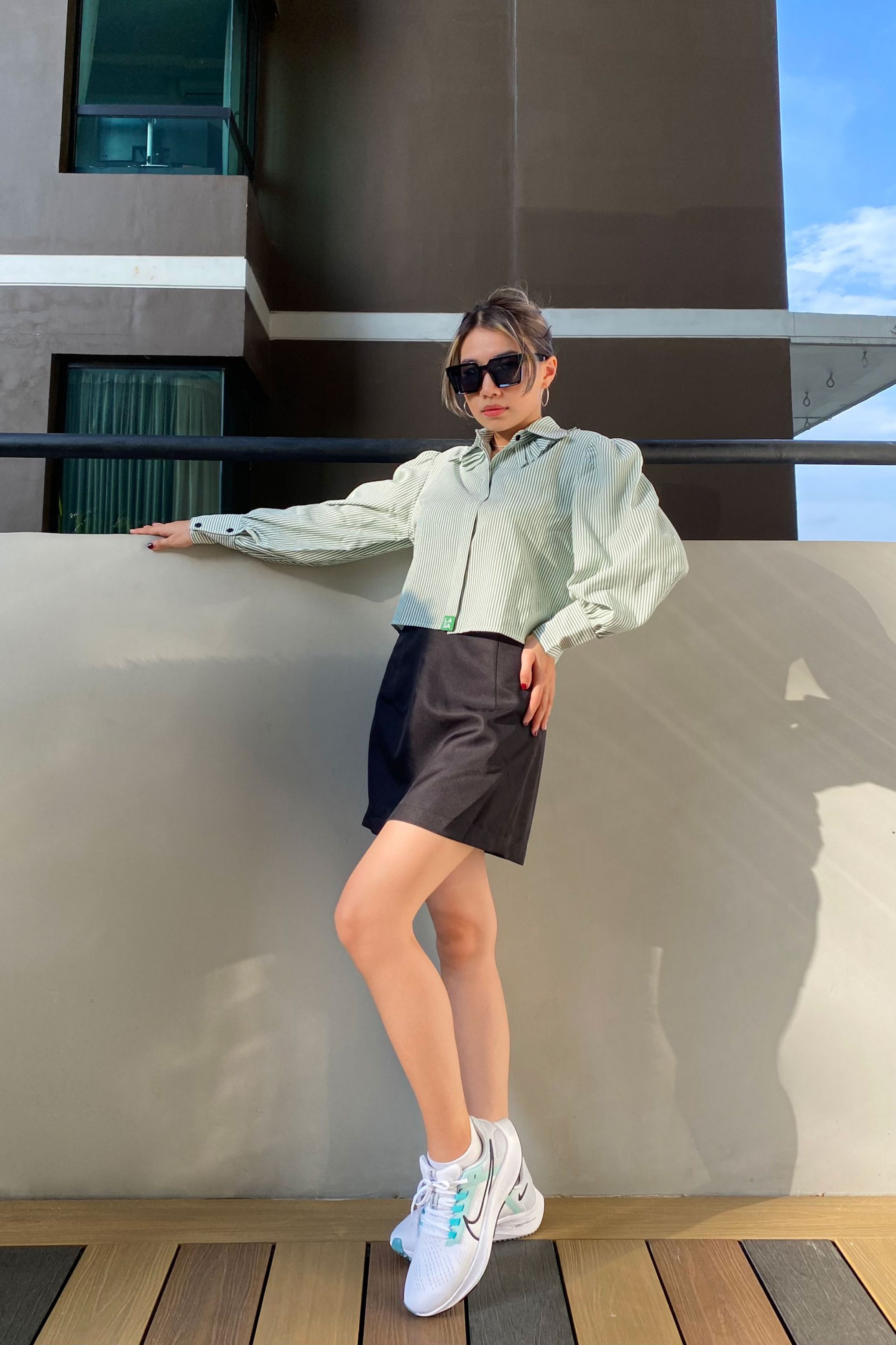 CHẤT SOMI COTTON PHA, MỀM ĐỨNG PHOM ÁO MÀU XANH LÁ SỌC TRẮNG ÁO CỔ SOMI KIỂU, TAY PHỒNG, NẸP ÁO GIẤU NÚT PHOM ÁO CROPTOP ĐIỂM NHẤN PHẦN XẾP LY Ở LÁ CỔ PHẦN