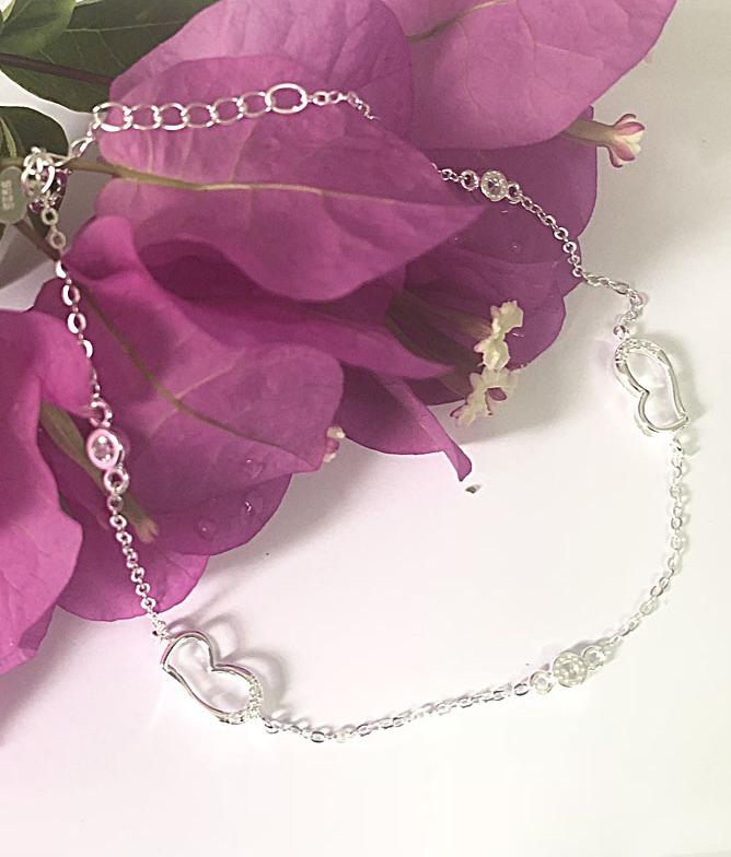 Lắc chân được chế tác từ bạc cao cấp S925 Lắc chân với thiết kế đơn giản bao gồm hai trái tim đính đá thể hiện tình cảm nồng nàn của người tặng và sự