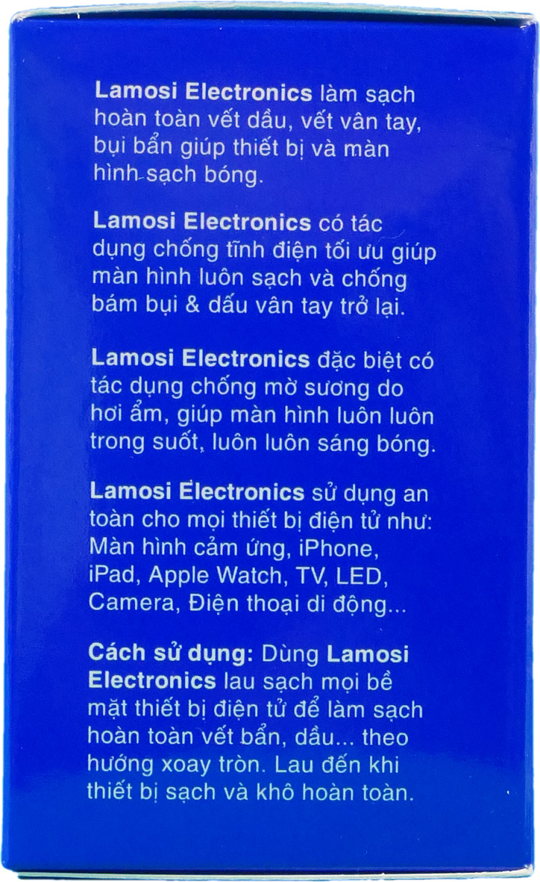 Lamosi Electronics với thành phần: Polyol Compound, Fragrance, Destat E501, Desfog FG21 sẽ giúp bạn làm sạch hoàn toàn vết dầu, vết vân tay, bụi bẩn giúp thiết bị và màn hình sạch bóng Lamosi Electronics có tác dụng chống tĩnh điện tối ưu giúp màn hình luôn sạch và chống bám bụi trở lại.