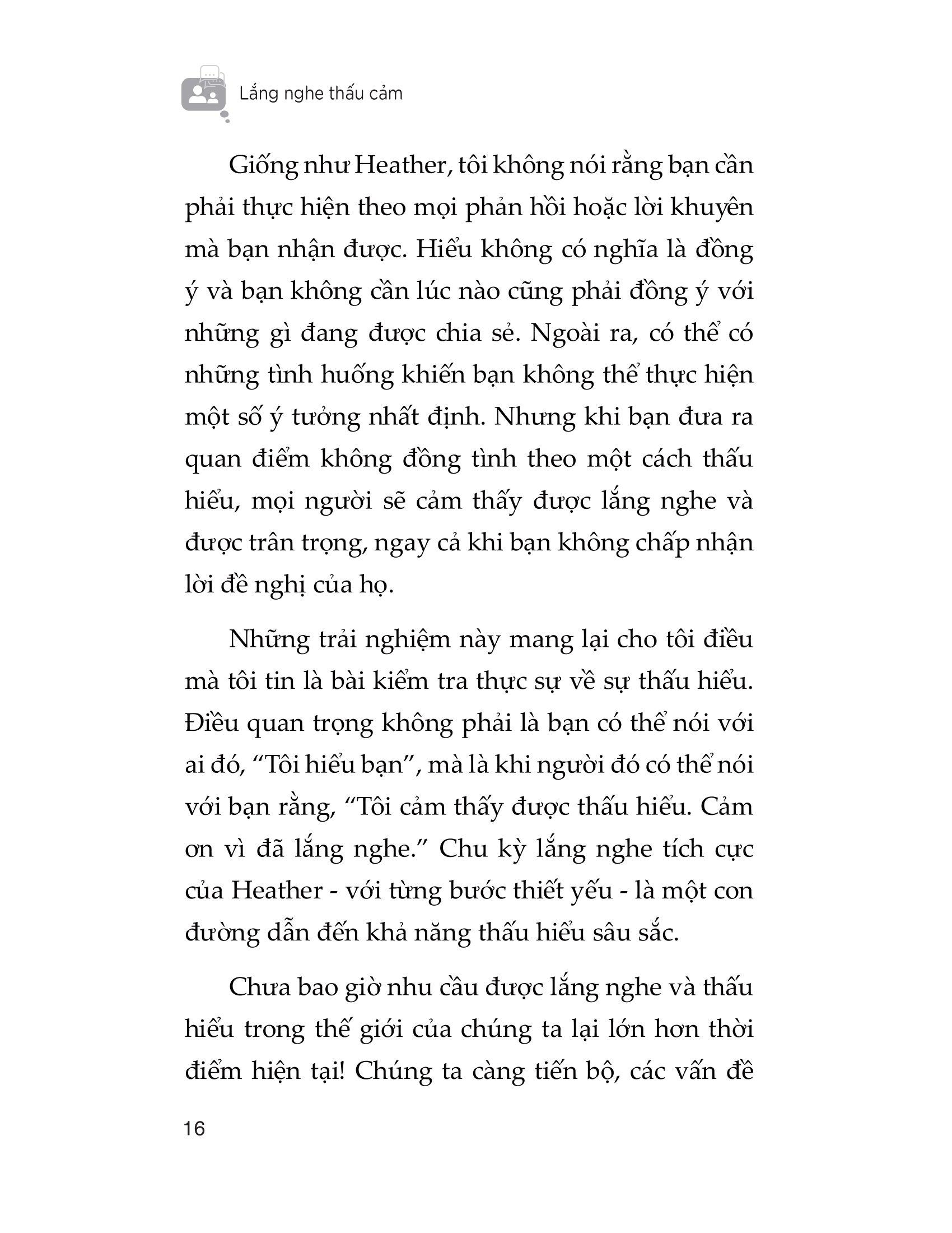Với tất cả những ai đang gặp khó khăn về vấn đề giao tiếp, đặc biệt là giao tiếp tại nơi làm việc, Lắng nghe thấu cảm chính là giải pháp kịp thời và cực kỳ hiệu quả. Cuốn sách của tác giả Heather Younger, hệ thống hóa một quy trình lắng nghe tích cực gồm năm bước đề cao tính ứng dụng và hành động. Quy trình này không chỉ mở ra tiềm năng của toàn bộ đội nhóm và tổ chức, mà còn giúp chúng ta mang đến cho người khác bầu không khí tích cực về cảm xúc và tâm lý - tạo ra một không gian mà mọi người cảm thấy được lắng nghe, được trân trọng và được thấu hiểu một cách chân thành.