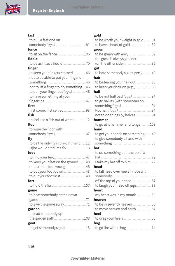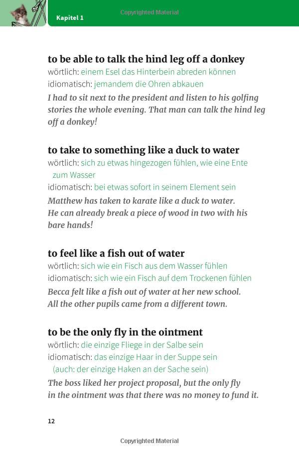 Jede Redewendung mit wörtlicher und idiomatischer Übersetzung sowie einem Anwendungsbeispiel