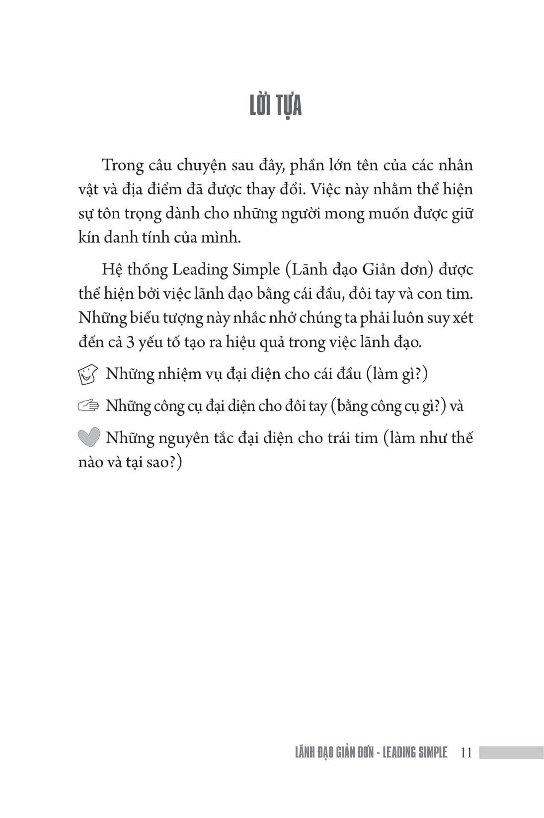 Mua tại TiktokTrong câu chuyện sau đây, phần lớn tên của các nhân vật và địa điểm đã được thay đổi. Việc này nhằm thể hiện sự tôn trọng dành cho những người mong muốn được giữ kín danh tính của mình. Hệ thống Leading Simple (Lãnh đạo Giản đơn) được thể hiện bởi việc lãnh đạo bằng cái đầu, đôi tay và con tim. Những biểu tượng này nhắc nhở chúng ta phải luôn suy xét đến cả 3 yếu tố tạo ra hiệu quả trong việc lãnh đạo. Những nhiệm vụ đại diện cho cái đầu (làm gì?) Những công cụ đại diện cho đôi tay (bằng công cụ gì?) và Những nguyên tắc đại diện cho trái tim (làm như thế nào và tại sao?) "Khả năng lãnh đạo làm nên sự khác biệt giữa thành công và thất bại: sự khác biệt giữa một cuộc sống viên mãn và những điều tầm thường đầy chán nản."