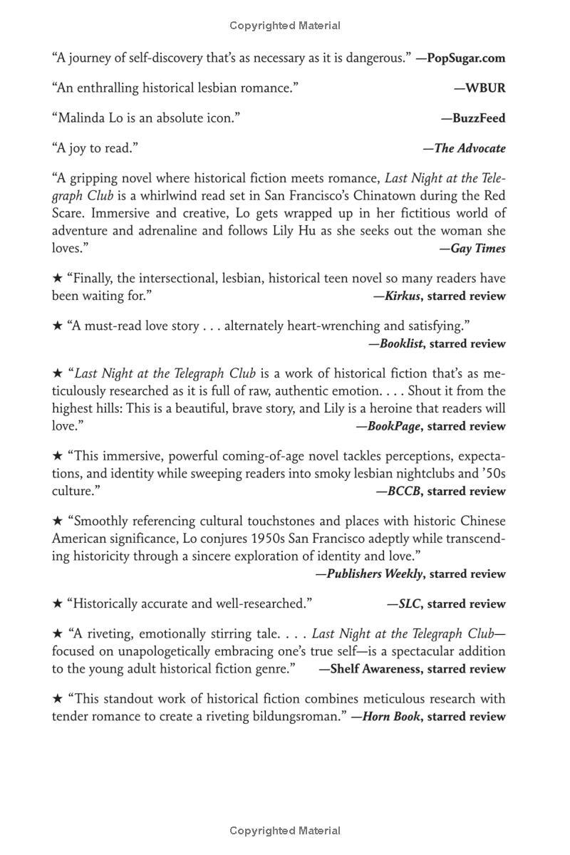 Seventeen-year-old Lily Hu can't remember exactly when the feeling took root—that desire to look, to move closer, to touch. Whenever it started growing, it definitely bloomed the moment she and Kathleen Miller walked under the flashing neon sign of a lesbian bar called the Telegraph Club. Suddenly everything seemed possible.