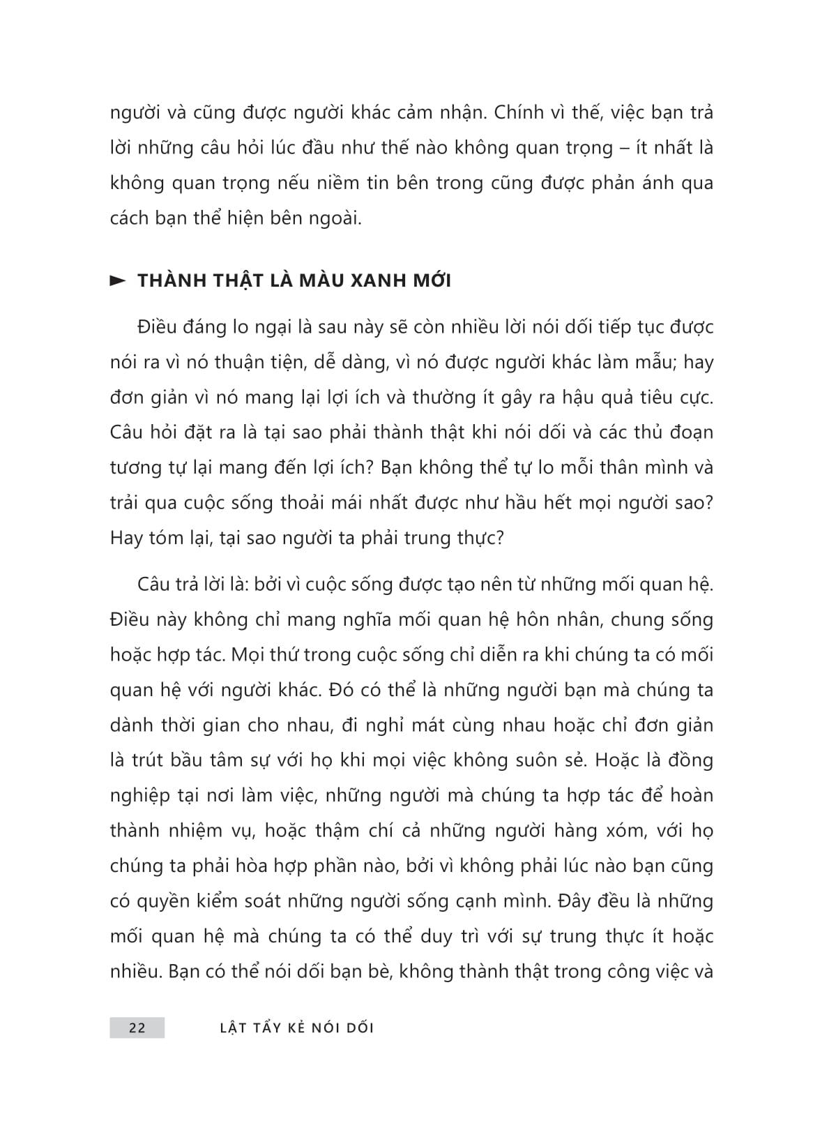 Dù bảo vệ sự thật không dễ dàng chút nào vì nói dối thuận tiện, dễ làm mẫu và mang lại lợi ích tức thời cho người nói, thì bạn vẫn nên hiểu rằng sự dối trá sẽ không giúp bạn đi xa. Cứ lạm dụng những lời nói dối vì ít để lại hậu quả thì về sau, dù bạn có nói thật cũng chẳng mấy ai tin. Đó là lý do chúng ta nên lựa chọn đứng về phía sự thật, LẬT TẨY KẺ NÓI DỐI, nhìn-thấu-điều-kẻ-khác-đang-che-giấu để biến môi trường xung quanh thành một nơi an toàn mà chúng ta được là chính m.ình.