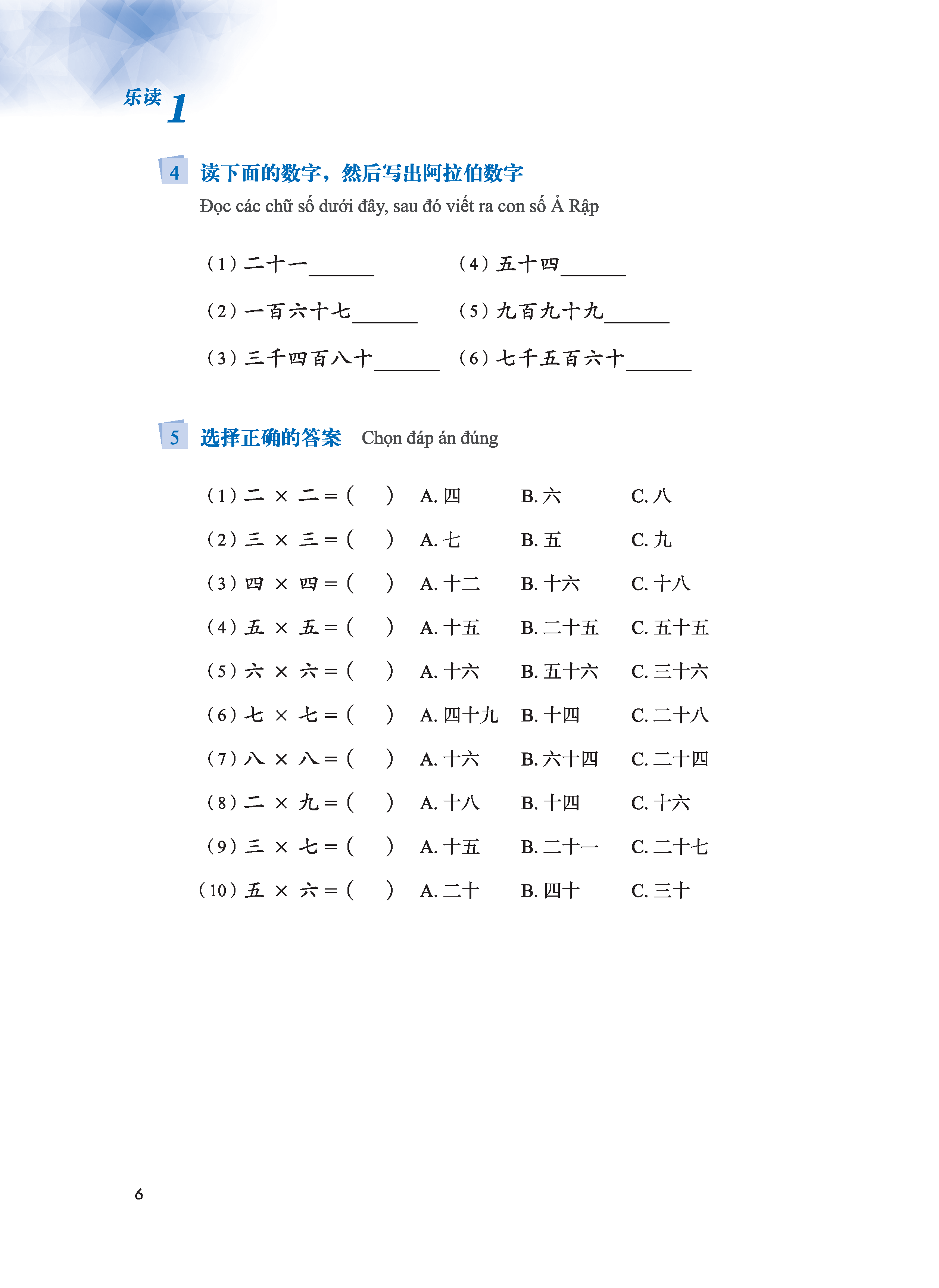 Mảng này là phần bài tập được thiết kế nhằm vào nội dung bài học. Việc thiết kế bài tập dựa theo nguyên tắc từ dễ đến khó, từ nội dung trong bài mở rộng đến ngoại khóa, từ chữ, từ (hoặc cụm từ), câu lại đến đoạn văn, từng bước dẫn dắt học sinh nắm vững nội dung bài học, đồng thời có thể dần dần hoàn thành bài tập một cách độc lập. Phần “Tập viết chữ Hán” chủ yếu để học sinh hoàn thành nhiệm vụ viết chữ trong ô vuông trên cơ sở nhận đọc chữ Hán và hiểu được nghĩa chữ, làm sâu sắc hơn sự lý giải và nắm vững về quy tắc kết cấu chữ Hán của học sinh. Nhằm vào những từ mới trọng điểm của mỗi bài, chúng tôi đã thiết kế bài tập “Chọn từ điền trống”. Mục đích chủ yếu của bài tập “Chọn câu trả lời thích hợp” là giúp người học nhận đọc câu trong ngữ cảnh. Phần “Câu đố” có độ khó nhất định, chủ yếu là để kiểm tra xem học sinh có am hiểu về cấu tạo, cách viết và các kiến thức có liên quan đến chữ Hán hay không, đáp án câu đố đều đến từ những chữ trọng điểm và những từ thường dùng xuất hiện trong bài đó. Theo sự gia tăng của lượng chữ mà người học phải học, bắt đầu từ bài 6, chúng tôi dùng những câu đơn giản cùng với từ mới xuất hiện trong bài đó để viết lại những mẩu truyện cười, mục đích là tái hiện và củng cố lại những nội dung đã học trong bài, bồi dưỡng hứng thú đọc cho học sinh.