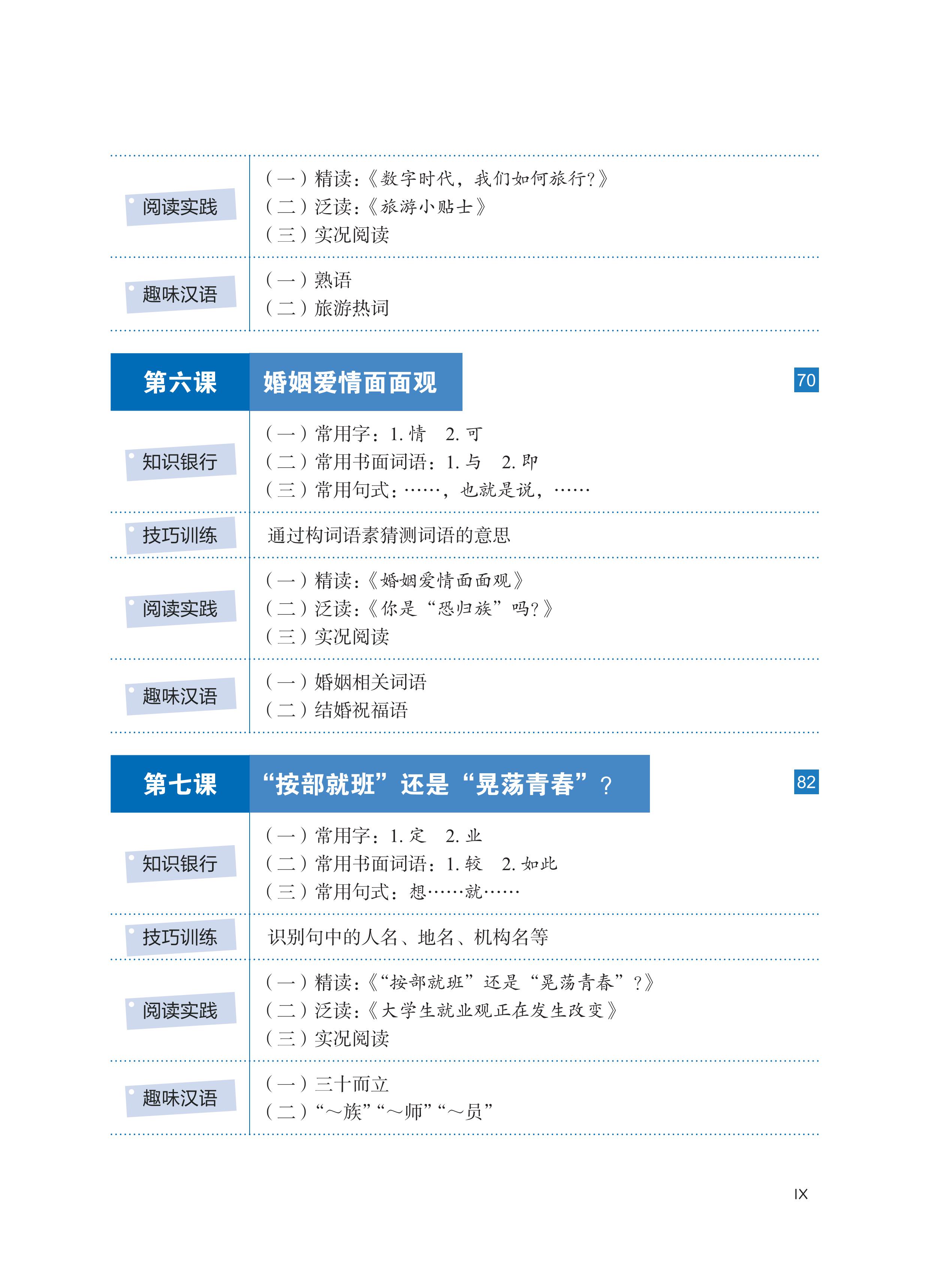 Phần 3: Thực tiễn đọc hiểu. Bao gồm ba phần lớn là đọc chuyên sâu, đọc mở rộng và đọc thực tế. Phần “Đọc chuyên sâu” và “Đọc mở rộng” bao gồm các nội dung như: học tập các từ vựng trọng tâm và từ vựng mở rộng thuộc các chủ đề thường gặp, bài tập khởi động, bài tập lý giải nội dung bài khóa, lý giải nghĩa câu và lý giải nghĩa từ, v.v., đồng thời trên cơ sở này hướng dẫn người học nắm được ý chính của bài khóa, vận dụng từ vựng trọng tâm thuộc chủ đề bài khóa để trình bày quan điểm, giới thiệu nội dung có liên quan một cách ngắn gọn. Phần “Đọc thực tế” bao gồm hai loại: Loại thứ nhất - “Đọc văn thuyết minh”, giúp người học tích lũy thường thức về lịch sử, văn hóa cần có đồng thời được tiếp xúc rộng rãi trong học tập và sinh hoạt thường ngày; loại thứ hai - “Tra tìm thông tin”, như tra tìm các thông tin du lịch, bảng giờ tàu xe, bảng các triều đại lịch sử, v.v., việc thiết kế nhiệm vụ nhấn mạnh tính ứng dụng, mục đích nhằm giúp người học giải quyết các vấn đề thường gặp trong học tập và sinh hoạt thường ngày.