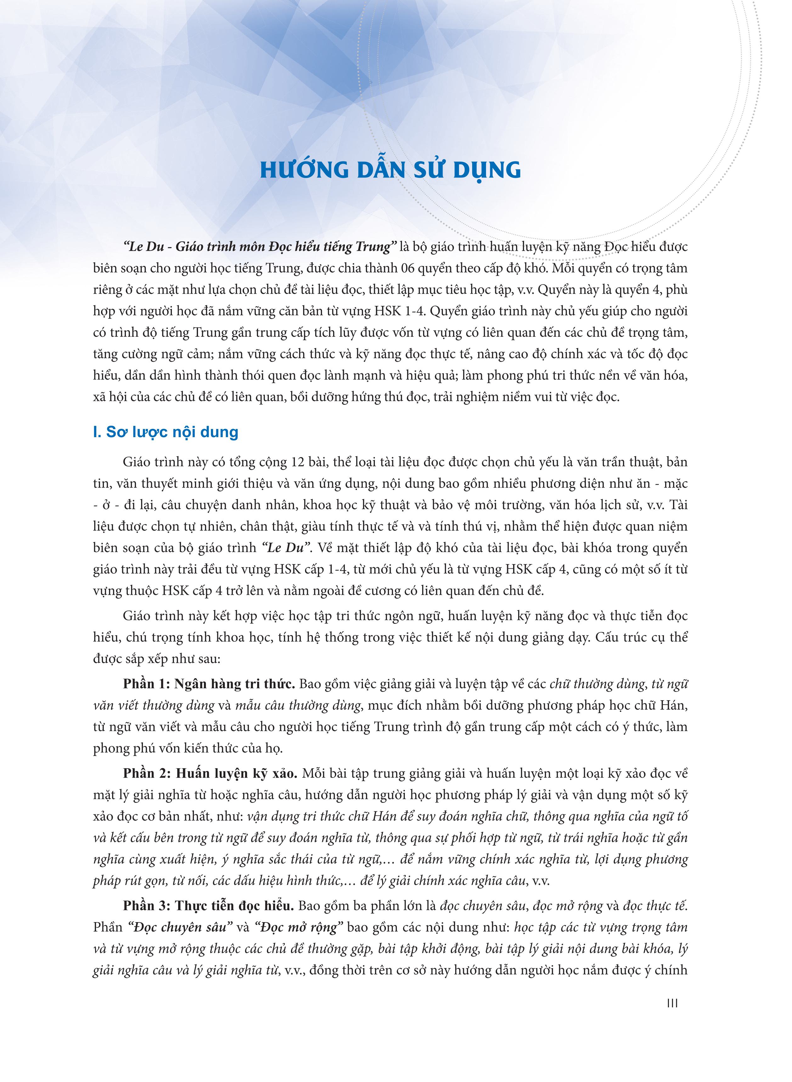“Le Du - Giáo trình môn Đọc hiểu tiếng Trung” là bộ giáo trình huấn luyện kỹ năng Đọc hiểu được biên soạn cho người học tiếng Trung, được chia thành 06 quyển theo cấp độ khó. Mỗi quyển có trọng tâm riêng ở các mặt như lựa chọn chủ đề tài liệu đọc, thiết lập mục tiêu học tập, v.v. Quyển này là quyển 4, phù hợp với người học đã nắm vững căn bản từ vựng HSK 1-4. Quyển giáo trình này chủ yếu giúp cho người có trình độ tiếng Trung gần trung cấp tích lũy được vốn từ vựng có liên quan đến các chủ đề trọng tâm, tăng cường ngữ cảm; nắm vững cách thức và kỹ năng đọc thực tế, nâng cao độ chính xác và tốc độ đọc hiểu, dần dần hình thành thói quen đọc lành mạnh và hiệu quả; làm phong phú tri thức nền về văn hóa, xã hội của các chủ đề có liên quan, bồi dưỡng hứng thú đọc, trải nghiệm niềm vui từ việc đọc.