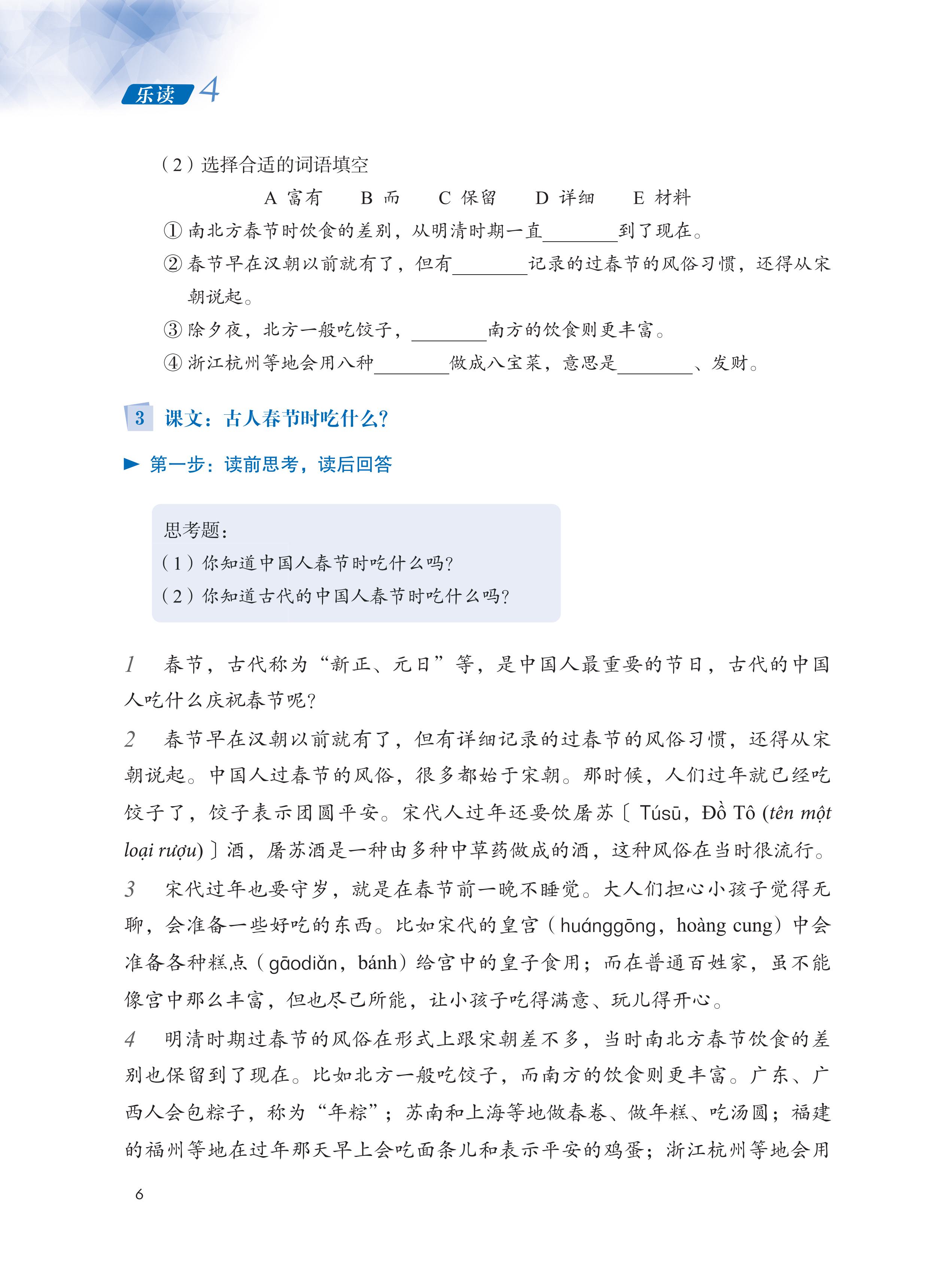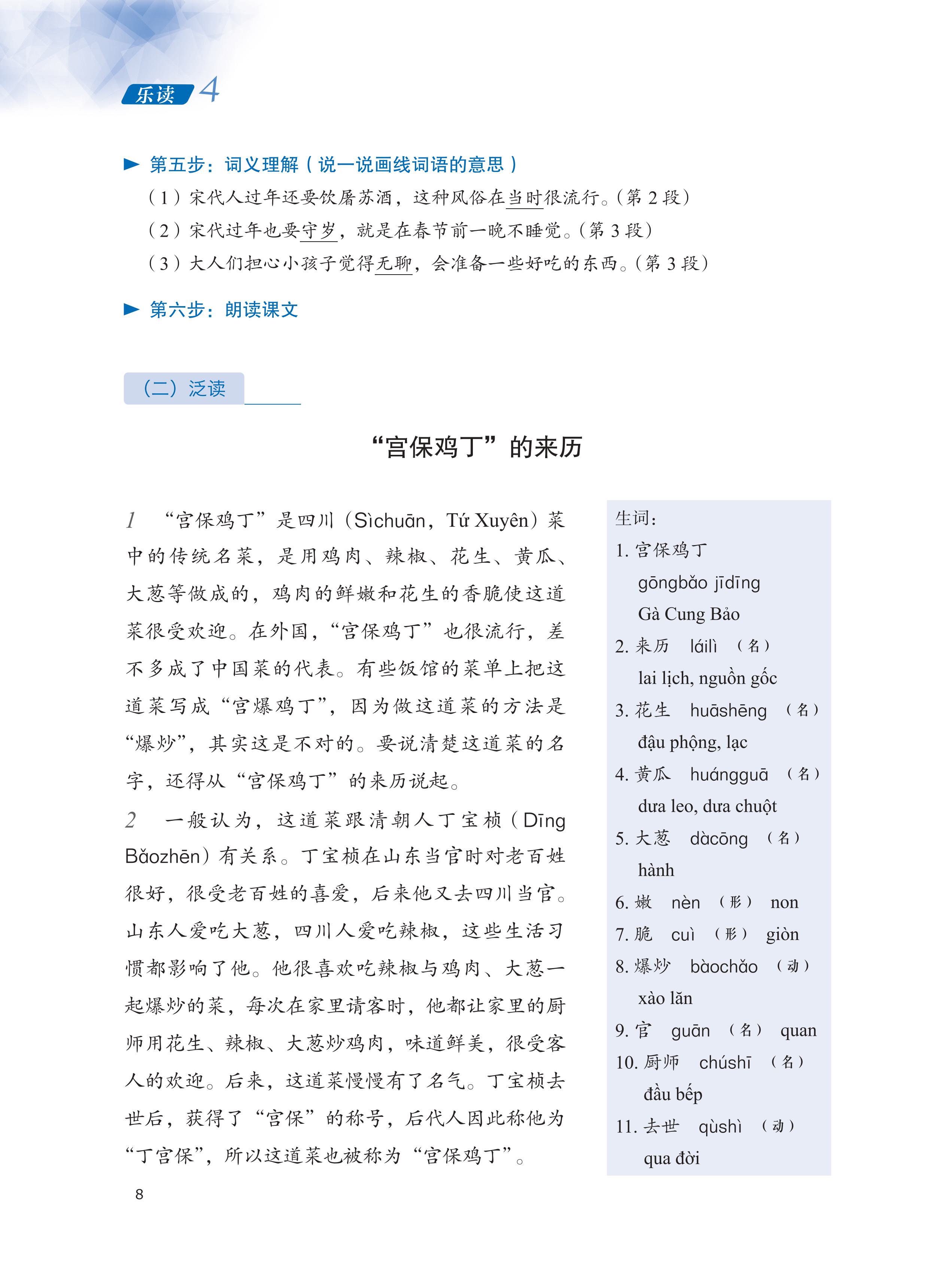 Phần 3: Thực tiễn đọc hiểu. Bao gồm ba phần lớn là đọc chuyên sâu, đọc mở rộng và đọc thực tế. Phần “Đọc chuyên sâu” và “Đọc mở rộng” bao gồm các nội dung như: học tập các từ vựng trọng tâm và từ vựng mở rộng thuộc các chủ đề thường gặp, bài tập khởi động, bài tập lý giải nội dung bài khóa, lý giải nghĩa câu và lý giải nghĩa từ, v.v., đồng thời trên cơ sở này hướng dẫn người học nắm được ý chính của bài khóa, vận dụng từ vựng trọng tâm thuộc chủ đề bài khóa để trình bày quan điểm, giới thiệu nội dung có liên quan một cách ngắn gọn. Phần “Đọc thực tế” bao gồm hai loại: Loại thứ nhất - “Đọc văn thuyết minh”, giúp người học tích lũy thường thức về lịch sử, văn hóa cần có đồng thời được tiếp xúc rộng rãi trong học tập và sinh hoạt thường ngày; loại thứ hai - “Tra tìm thông tin”, như tra tìm các thông tin du lịch, bảng giờ tàu xe, bảng các triều đại lịch sử, v.v., việc thiết kế nhiệm vụ nhấn mạnh tính ứng dụng, mục đích nhằm giúp người học giải quyết các vấn đề thường gặp trong học tập và sinh hoạt thường ngày.