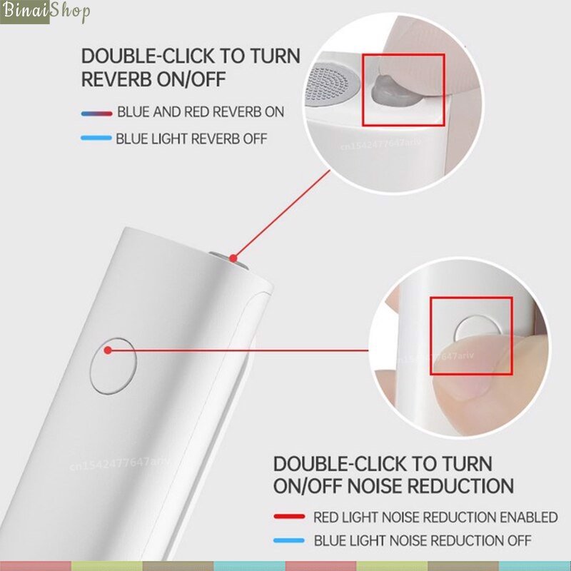 - Tích hợp 2 chế độ vang và giảm tiếng ồn: ấn liên tục 2 lần nút bên cạnh đầu micro để bật/tắt vang (ON: đèn đỏ, OFF: đèn xanh), ấn liên tục 2 lần nút nguồn để bật/tắt lọc tiếng ồn (ON: đèn đỏ, OFF: đèn xanh).