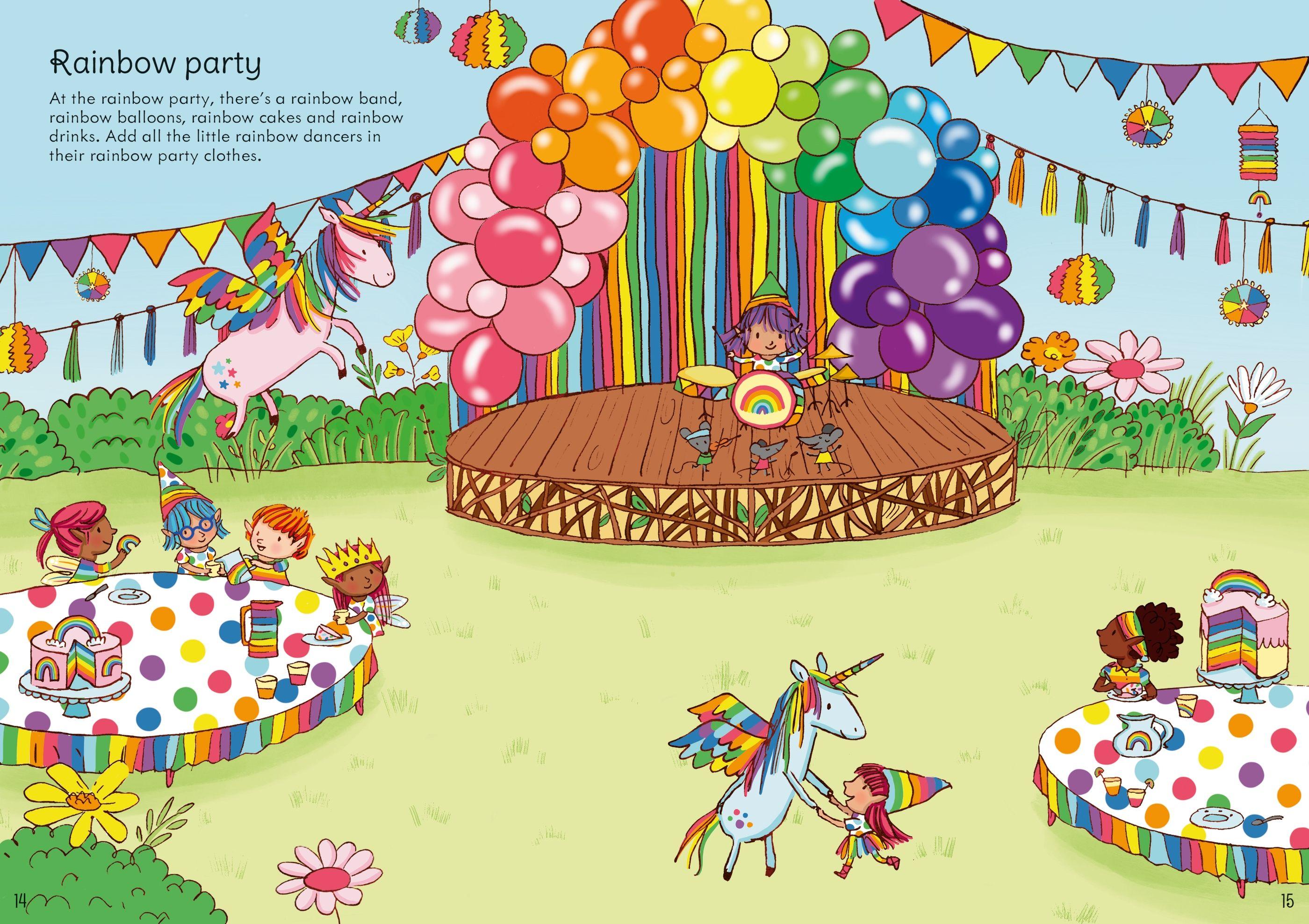 Join the the fairies and pixies as they splash in rainbow puddles, paint rainbows in the sky, play with unicorns, prepare for a rainbow party and snuggle up in rainbow beds at the end of the day. The delightful scenes include a magical meadow with unicorns, butterflies and flowers; fairy houses; fairy baking; a fairytale castle and an enchanted wood.