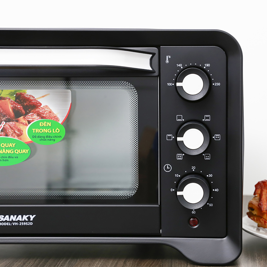 Thiết kế gọn nhẹ, tiện dụng Lò Nướng Sanaky VH-259S2D có thiết kế đẹp mắt, gọn đẹp, lắp đặt và sử dụng thuận lợi trong mọi gian bếp. Khoang lò bằng thép không gỉ, vỏ thép phủ sơn tĩnh điện chịu nhiệt tốt, cho bạn sử dụng lâu bền với thời gian. Lò có thể dùng nướng thịt, cá, nướng bánh… giúp bạn chuẩn bị các món nướng đa dạng, dễ dàng. Dung tích lò nướng 25L Sanaky VH-259S2D sỡ hữu một khoang lò có dung tích 25L, có thiết kế rộng rãi, thông thoáng, bền đẹp, chắc chắn kết hợp cùng một khay hứng mỡ trong khi nướng giúp giữ vệ sinh cho khoang lò, từ đó người nội trợ sẽ dễ dàng lau chùi, làm sạch hơn sau mỗi lần nấu nướng. Với dung tích này, lò thích hợp cho không gian bếp nhỏ, nướng một lượng thức ăn cho gia đình có từ 2 – 4 thành viên. Tích hợp đèn chiếu sáng trong khoang lò Trong khoang lò có trang bị đèn bên trong giúp bạn theo dõi quá trình nướng dễ dàng mà không cần mở cửa lò ra, rất tiện dụng. Công suất hoạt động 1400W Hoạt động với công suất 1400W mạnh mẽ, ổn định cùng công nghệ làm nóng bằng điện trở giúp tỏa nhiệt đều khắp trong khoang lò, từ đó món ăn sẽ được chín vàng và thơm ngon hơn rất nhiều.  Chức năng nướng xiên quay Tích hợp thêm tính năng nướng xiên quay đặc biệt, đây là tính năng giúp người dùng có thể nướng nguyên cả một con gà hoặc một khối từ 2kg trở xuống, rất hữu ích để dùng trong những buổi tiệc với người thân hay bạn bè.   Điều khiển dễ dàng Lò nướng Sanaky VH259S2D được trang bị núm vặn điều khiển với các chỉ dẫn dễ hiểu, ngay cả người lớn tuổi đều dễ dàng sử dụng lò. Đi kèm với lò là bộ khay nướng, xiên quay, vỉ nướng, tay cầm vỉ nướng, tay cầm xiên quay giúp hỗ trợ người dùng nấu nướng thuận lợi, nhanh chóng hơn.