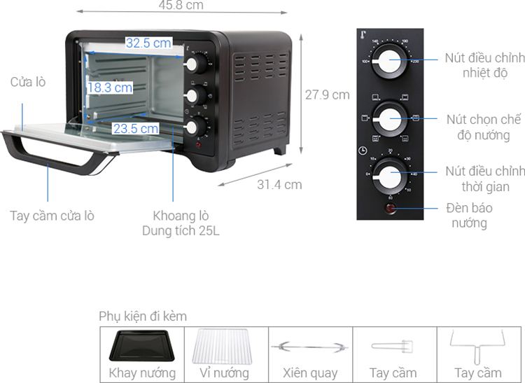 - Thiết kế hiện đại - Dung tích: 32 lít - Công suất: 2 thanh nhiệt (1500W), 1 thanh nhiệt (750W) - Nhiệt độ: 70 - 230ºC - Hẹn giờ: 120 phút/lần - Chất kiệu