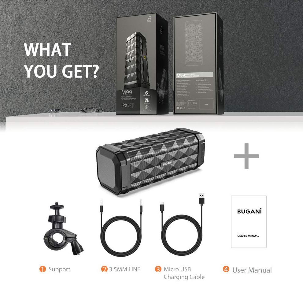 - Loa BUGANI M99 hỗ trợ kết nối với điện thoại thông minh, máy tính bảng và tất cả các thiết bị hỗ trợ Bluetooth khác. Với cổng TF hỗ trợ thẻ nhớ Micro SD tối đa 32GB