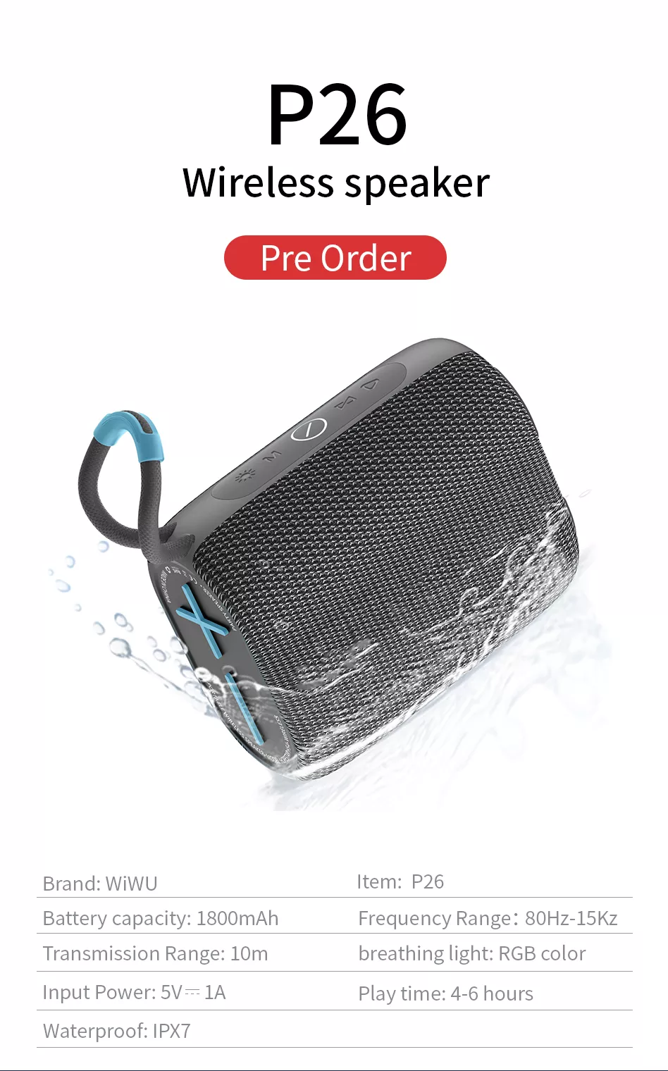 Loa bluetooth chống nước chuẩn IPx7 hiệu WIWU Thunder P26 Thuộc phân khúc loa di động kết nối đa tính năng như nghe đài FM, phát nhạc thẻ SD, USB và đầu vào AUX 3.5mm cắm trực tiếp từ thiết bị phát nhạc không qua bluetooth.