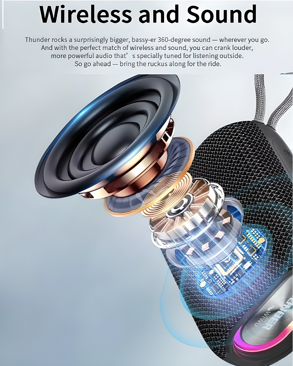 Loa di động thể thao bluetooth chống nước chuẩn IPx7 hiệu WIWU Thunder P26 trang bị đèn LED đổi màu, công nghệ Bluetooth 5.0, Nghe đài radio FM, thẻ SD, có jack âm thanh AUX 3.5mm, thời gian nghe nhạc lên đến 6h