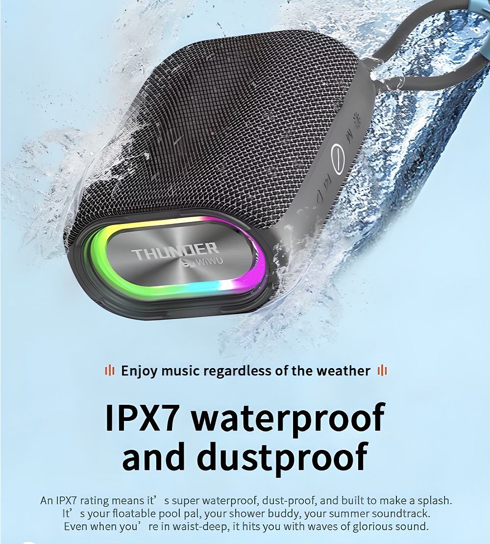 Với Loa bluetooth chống nước chuẩn IPx7 hiệu WIWU Thunder P26 bạn có thể sử dụng trong môi trường có nước văng, bể bơi hay ở bãi biển có chống nước tốt. Với tầm giá khoảng 1 triệu đồng trên thị trường IPx7 cũng không còn xa lạ tuy nhiên với WIWU P26 thiết kế liên khối sẽ giúp khả năng chống nước tốt hơn nữa vượt trội so với chuẩn IPx4 phổ biến cho các dòng loa hiện nay.