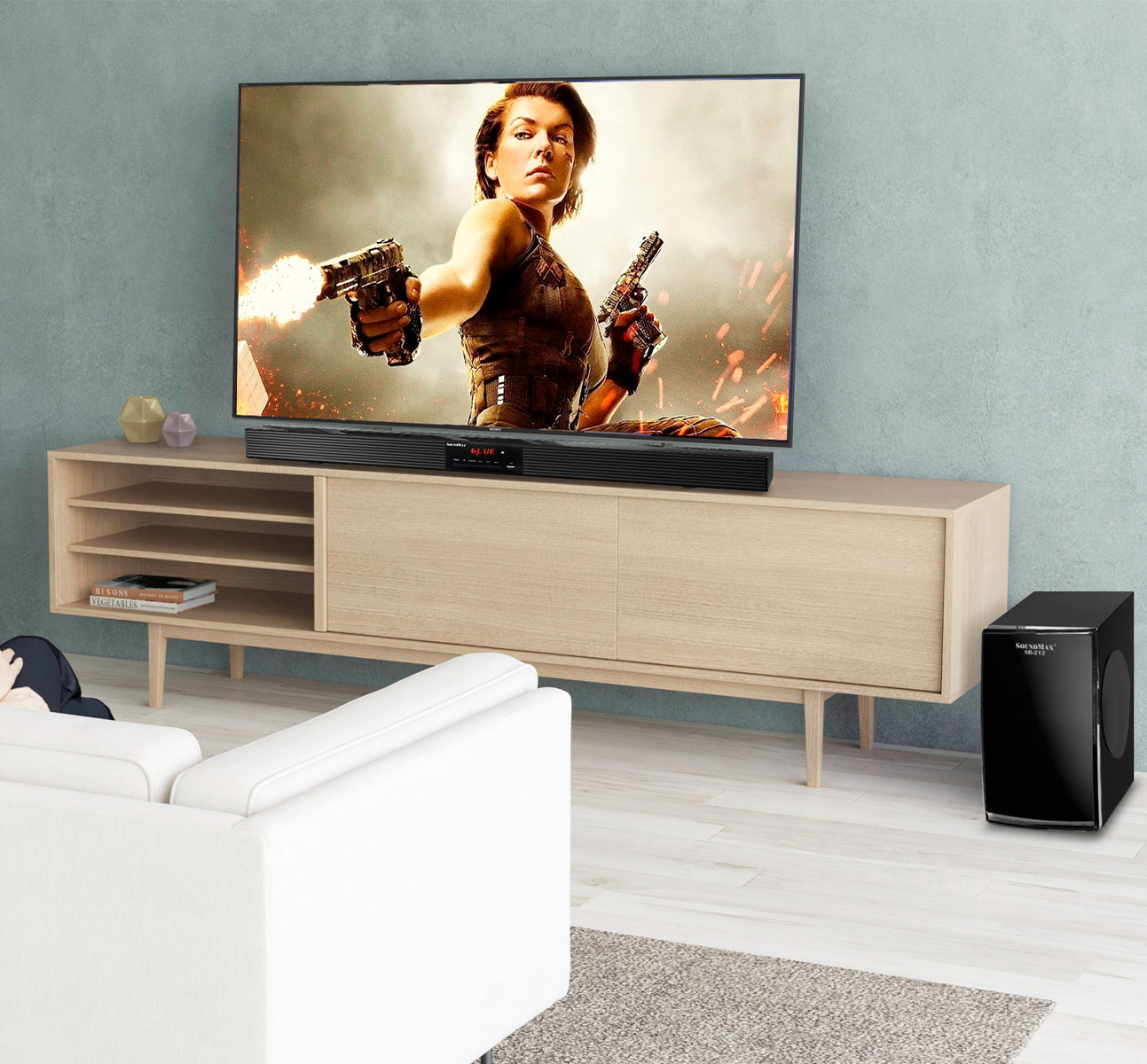 - Hệ thống loa soundbar 2.1, cho âm thanh trong trẻo, rõ ràng, âm trầm mạnh mẽ nghe được nhiều thể loại nhạc.