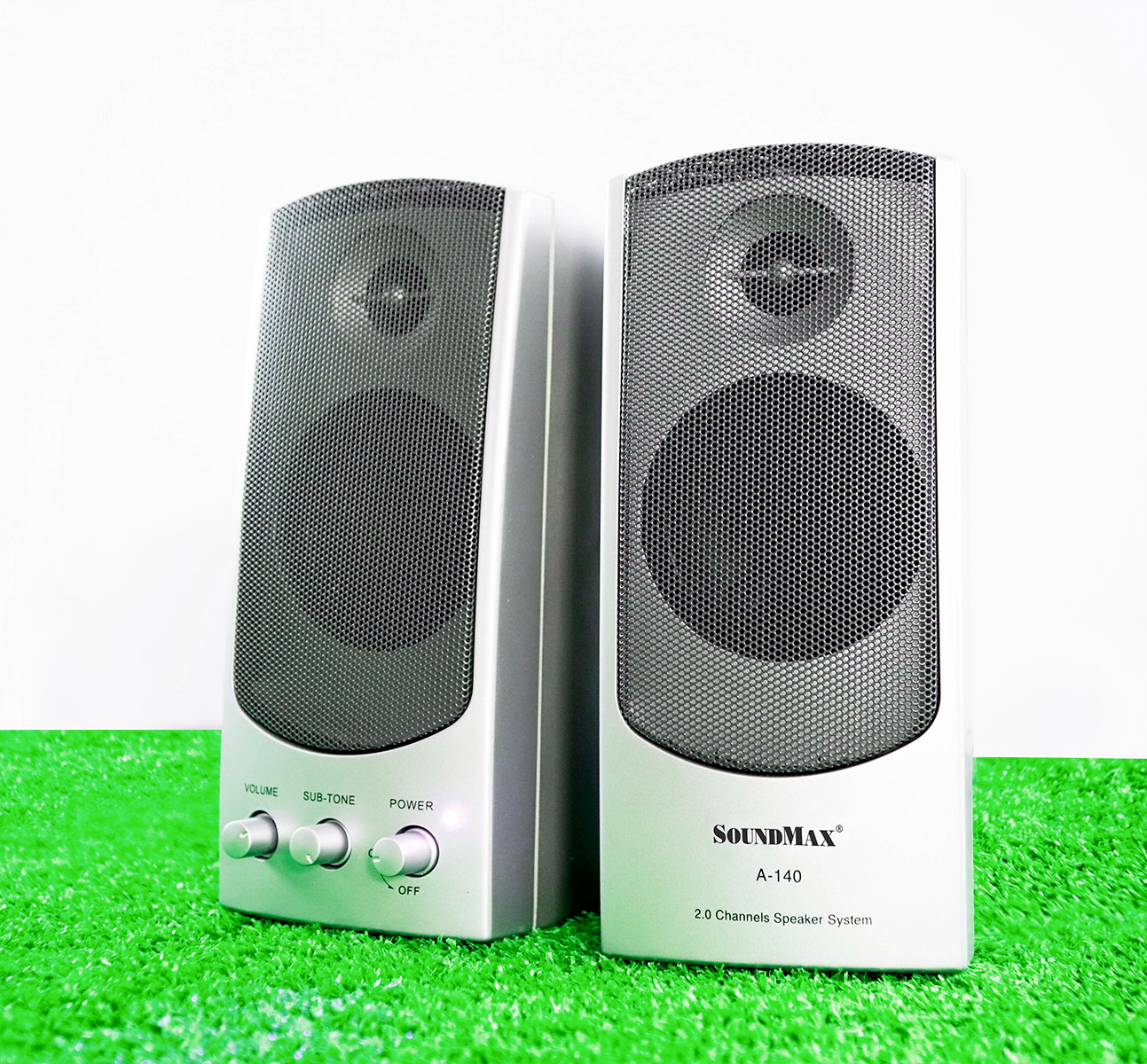 Loa SoundMax A140 2.0 thiết kế 2 loa rời hình hộp cách điệu nhỏ nhắn, màu bạc sang trọng. Mặt trước loa có 3 nút điều chỉnh rất thuận thiện cho các thao tác: Nguồn –
