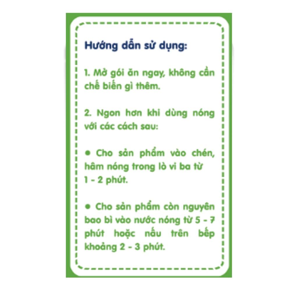 • Dùng nóng: Cho sản phẩm vào chén hâm nóng trong lò vi sóng từ 1-2 phút, không được cho trực tiếp bao bì vào lò vi sóng. Hoặc cho sản phẩm còn nguyên bao bì vào nước nóng 5-7 phút hay nấu trên bếp khoảng 2-3 phút.