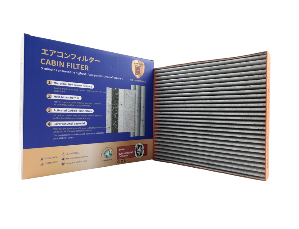 Lọc Gió Điều Hòa Ô Tô Cao Cấp Macsim N95  – Công Nghệ Nhật Bản  – Lọc Sạch Bụi Mịn PM2.5  – Kháng Khuẩn  – Khử Mùi  Thương hiệu: Macsim   Loại sản phẩm: Lọc gió điều hòa ô tô cao cấp  Công nghệ: Chuẩn lọc N95  – Sản xuất trên dây chuyền lọc gió của xe điện Tesla           CÔNG DỤNG VƯỢT TRỘI ️ Lọc sạch không khí tới 85–95%, chống bụi mịn PM2.5, khói thuốc, khí độc hại ️ Kháng khuẩn, kháng virus, ngăn ngừa nấm mốc và phấn hoa ️ Khử mùi hiệu quả, giúp cabin luôn trong lành, sạch sẽ ️ Bảo vệ hệ hô hấp cho cả gia đình, đặc biệt là trẻ nhỏ, người lớn tuổi, người nhạy cảm   CẤU TẠO CAO CẤP  – 4 LỚP LỌC CHUYÊN SÂU Lớp 1: Màng sợi nhỏ tích điện – chặn khói, bụi kích thước lớn Lớp 2: Vải không dệt – chống nước, chống ẩm Lớp 3: Lõi than hoạt tính – khử mùi, hấp thụ khí độc Lớp 4: Màng diệt vi khuẩn, virus, nấm mốc  Không giống các loại lọc gió thông thường chỉ lọc bụi thô, Macsim N95 còn ngăn chặn bụi mịn cực nhỏ, giúp lọc không khí toàn diện hơn.   VÌ SAO BẠN CẦN SẢN PHẨM NÀY? Hiện nay, ô nhiễm không khí, bụi mịn PM2.5 tại các thành phố lớn ở Việt Nam đang ở mức báo động. Những hạt bụi cực nhỏ này có thể xâm nhập vào máu, phá hủy phổi, gây ung thư và nhiều bệnh nguy hiểm khác.  Khi di chuyển bằng ô tô, cabin xe tưởng là nơi an toàn, nhưng thực tế khói bụi vẫn len lỏi qua hệ thống điều hòa nếu không dùng lọc chất lượng cao. ️ Macsim N95 chính là “lá chắn” giúp bảo vệ bạn và gia đình mỗi hành trình.   THỜI GIAN SỬ DỤNG  – BẢO DƯỠNG Dùng tối đa 20.000 km (khuyến nghị thay sau 10.000 km)