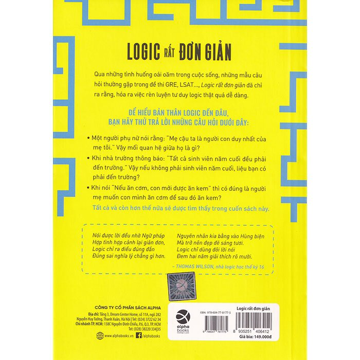 Mua tại TiktokLogic Rất Đơn Giản - Deborah J. Bennett - Linh Chi dịch - (bìa mềm) - Giá bìa: 149.000đ Qua những tình huống khó khăn cần xử trí trong cuộc sống, những câu hỏi giúp bạn cải thiện điểm thi trong bài GRE, LSAT…, Logic rất đơn giản đã chỉ ra rằng, logic hóa ra không phải là điều bất khả. Cuốn sách này không giống những cuốn sách khác về logic. Ở đây, bạn sẽ hiểu được tại sao tư duy logic lại không hề dễ dàng. Nếu bạn nghĩ mình khá logic thì hãy thử một vài câu đố logic mà những người khác thấy khó nhằn. Kể cả nếu bản thân bạn không mắc bẫy tư duy, cuốn sách này cũng sẽ giúp bạn hiểu những khó khăn mà người khác gặp phải. BẠN LOGIC ĐẾN ĐÂU? BẠN CÓ THỂ TRẢ LỜI NHỮNG CÂU HỎI SAU?