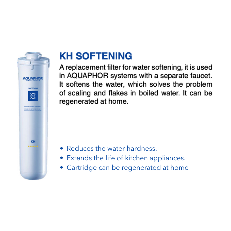 • Lõi Lọc Nước AQUAPHOR KH thay thế để làm mềm nước. Giảm cặn vôi tích tụ trong nước cứng. Chứa nhựa trao đổi ion.