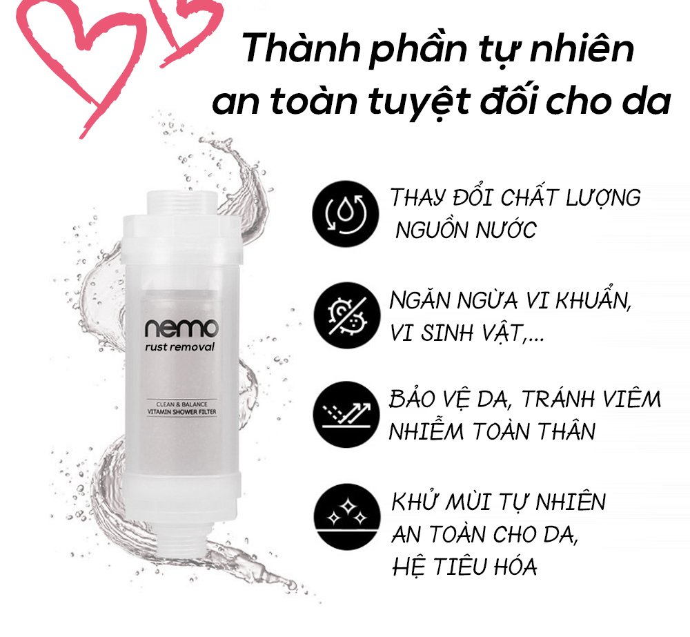 Lõi lọc nước Nemo với màng lọc thông minh giúp loại bỏ 99% các cặn bẩn, chất ô nhiễm li ti, các tạp chất lơ lửng trong nước, rỉ sét, bùn đất, vi khuẩn gây bệnh và các kim loại nặng, cho ra nguồn nước sạch và an toàn hơn để sử dụng trong quá trình sinh hoạt hàng ngày và giúp tăng tuổi thọ cho các đồ dùng, vật dụng trong gia đình.