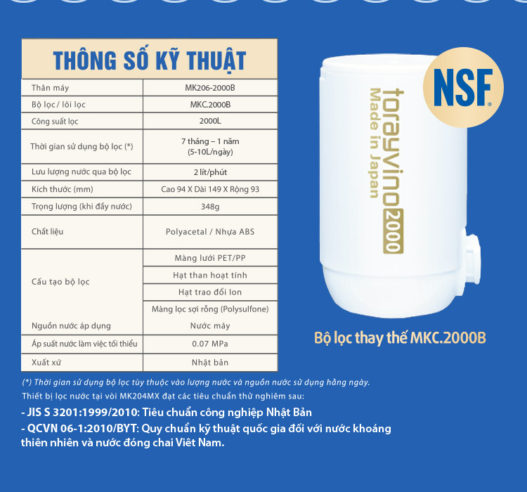 Lõi Lọc Thay Thế Torayvino MKC.2000B là lõi lọc nước mới nhất đến từ Nhật Bản cho các dòng thiết bị lọc nước tại vòi Torayvino với công suất lên đến 2000L, loại bỏ 13 tạp chất và 99,99% vi khuẩn có hại trong nước máy nhưng vẫn giữ nguyên được khoáng chất cần thiết cho nhu cầu uống trực tiếp và sử dụng nước sạch hàng ngày của gia đình. Vì sao nên sử dụng máy lọc nước đến từ Nhật Bản Torayvino Đặc điểm của bộ lọc nước thay thế Torayvino MKC.2000B: