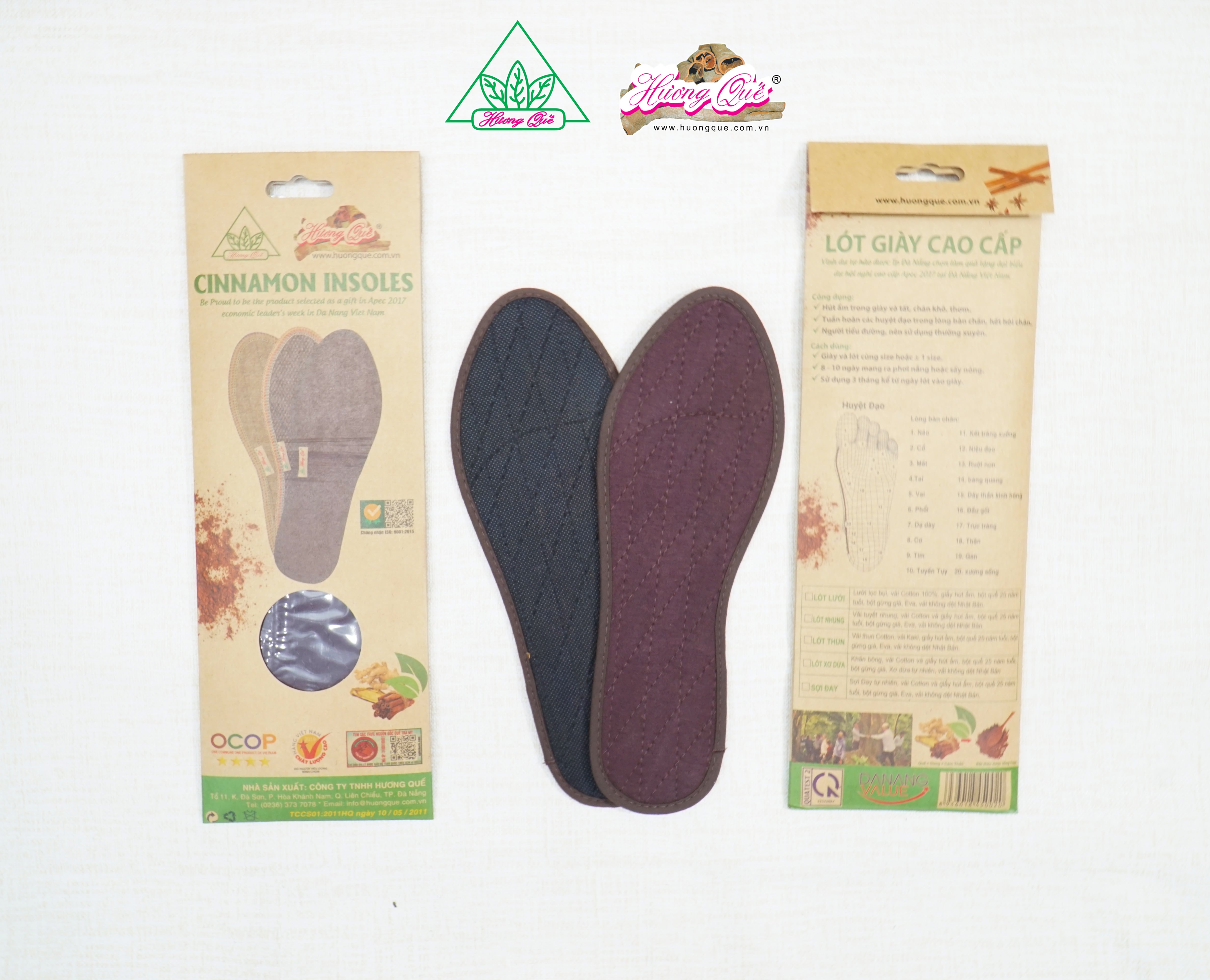 - Lót giày vải Hương Quế có thành phần từ cây Quế Trà My - Quảng Nam (là một trong bốn thảo dược quý Sâm - Nhung - Quế - Phụ) có chất lượng