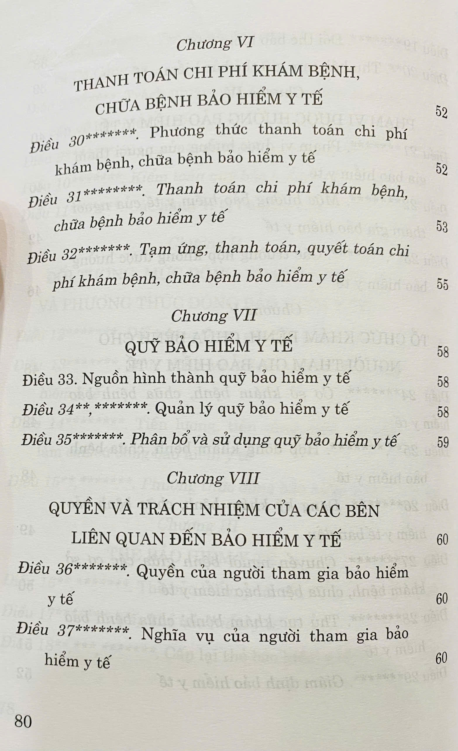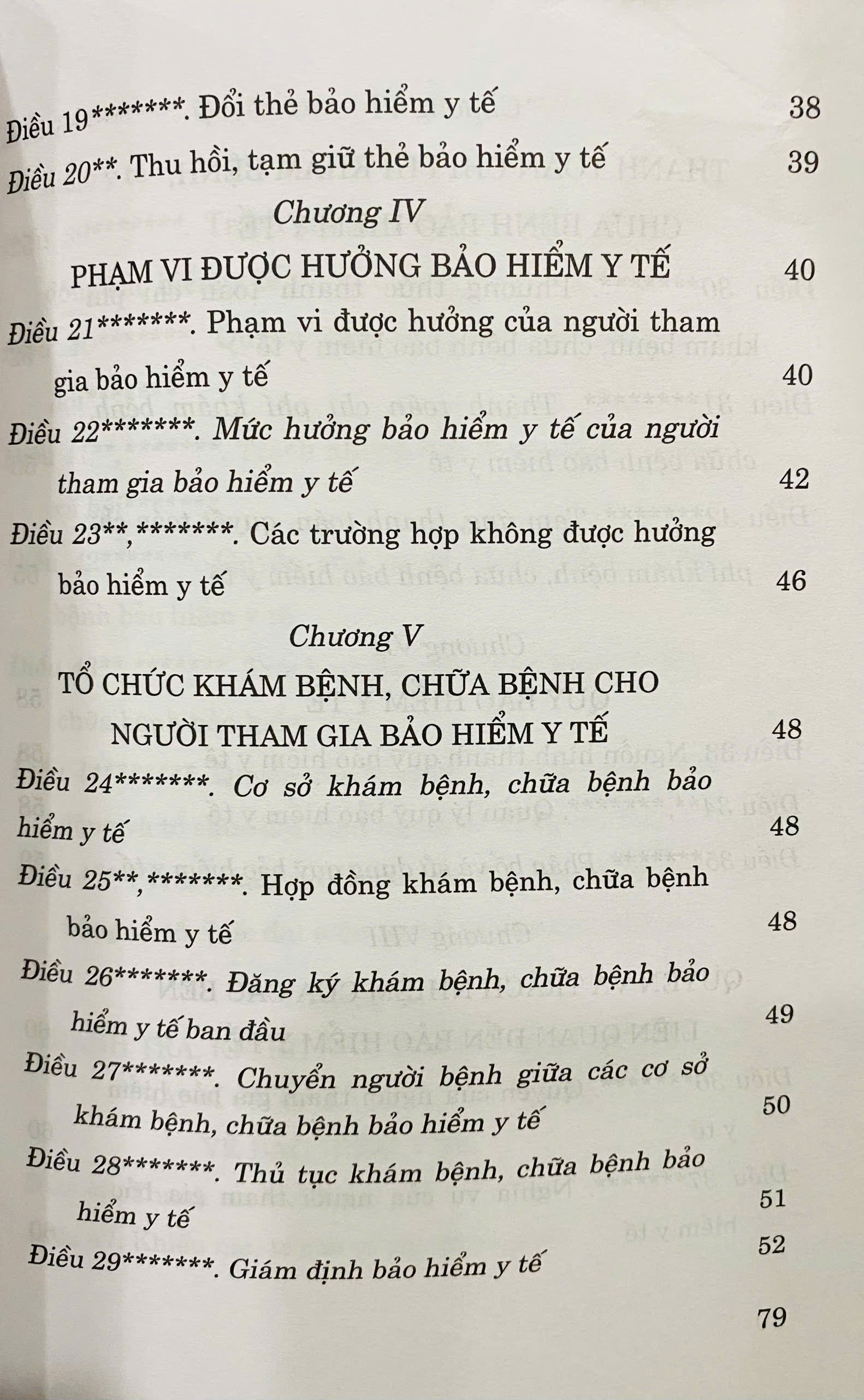 Luật Bảo hiểm y tế năm 2008 đã được Quốc hội nước Cộng hòa xã hội chủ nghĩa Việt Nam khóa XII, kỳ họp thứ 4 thông qua ngày 14/11/2008, quy định về chế độ, chính sách bảo hiểm y tế, bao gồm đối tượng, mức đóng, trách nhiệm và phương thức đóng bảo hiểm y tế; thẻ bảo hiểm y tế; phạm vi được hưởng bảo hiểm y tế; tổ chức khám bệnh, chữa bệnh cho người tham gia bảo hiểm y tế; thanh toán chi phí khám bệnh, chữa bệnh bảo hiểm y tế; quỹ bảo hiểm y tế; quyền và trách nhiệm của các bên liên quan đến bảo hiểm y tế.