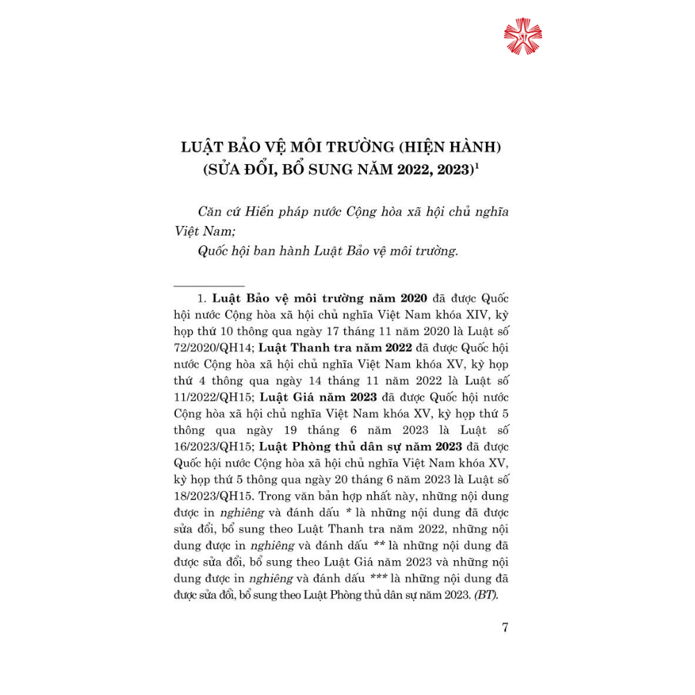 Cuốn sách “Luật Bảo vệ môi trường (hiện hành) (sửa đổi, bổ sung năm 2022, 2023)” cung cấp một cái nhìn toàn diện về những thay đổi và cập nhật trong luật pháp Việt Nam liên quan đến bảo vệ môi trường. Đây là một nguồn tài liệu quý giá cho các nhà hoạch định chính sách, học giả, và công dân quan tâm đến việc bảo tồn và cải thiện môi trường sống.