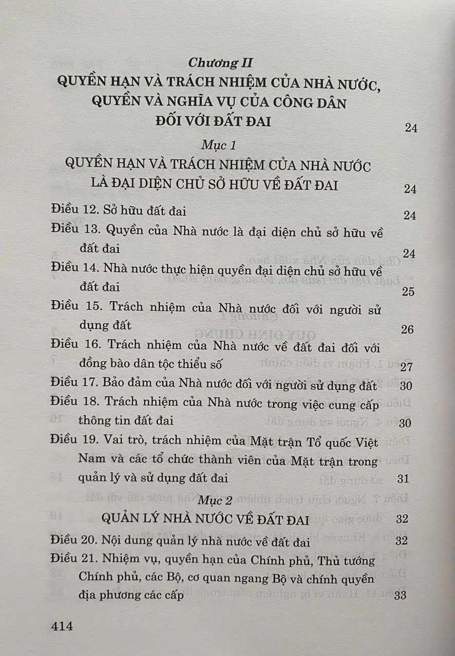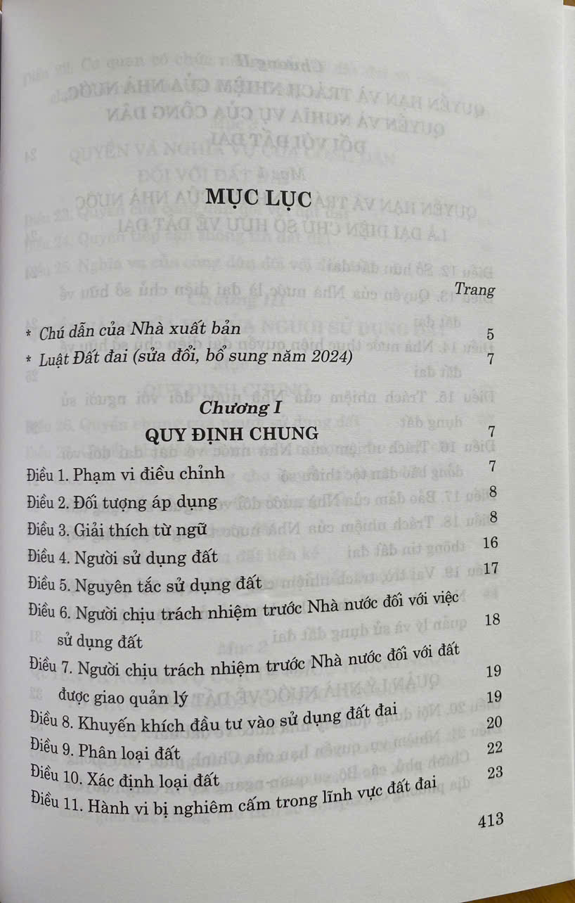 Luật Đất đai số 31/2024/QH15 được Quốc hội khóa XV thông qua ngày 18/01/2024. Luật Đất đai năm 2024 gồm 16 chương, 260 điều, trong đó sửa đổi, bổ sung 180 điều của Luật