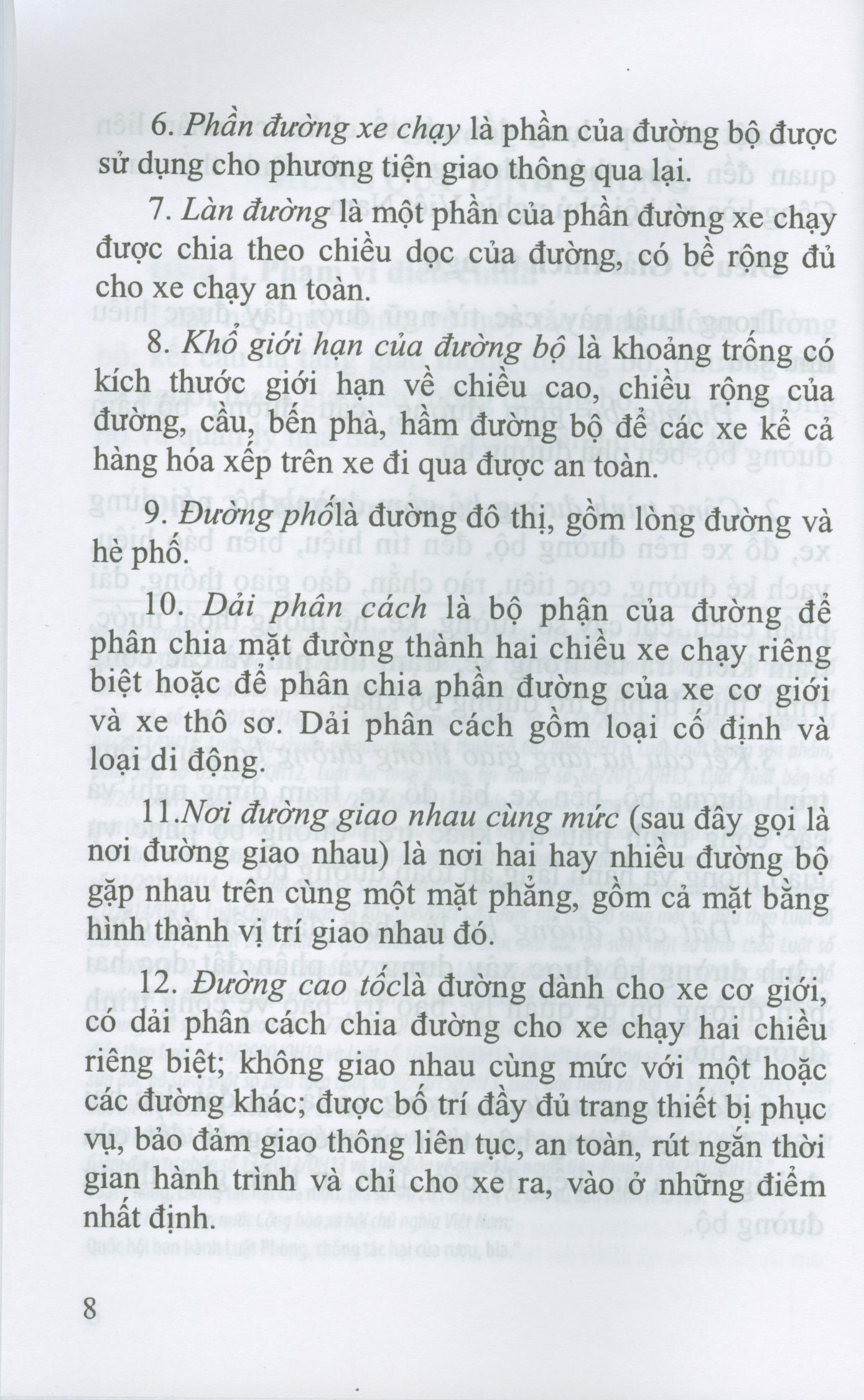 Mua tại TiktokĐiều 1. Phạm vi điều chỉnh Luật này quy định về quy tắc giao thông đường bộ; kết cấu hạ tầng giao thông đường bộ; phương tiện và người tham gia giao thông đường bộ; vận tải đường bộ và quản lý nhà nước về giao thông đường bộ. Điều 2. Đối tượng áp dụng Luật này áp dụng đối với tổ chức, cá nhân liên quan đến giao thông đường bộ trên lãnh thổ nước Cộng hòa xã hội chủ nghĩa Việt Nam. Điều 3. Giải thích từ ngữ Trong Luật này, các từ ngữ dưới đây được hiểu như sau: